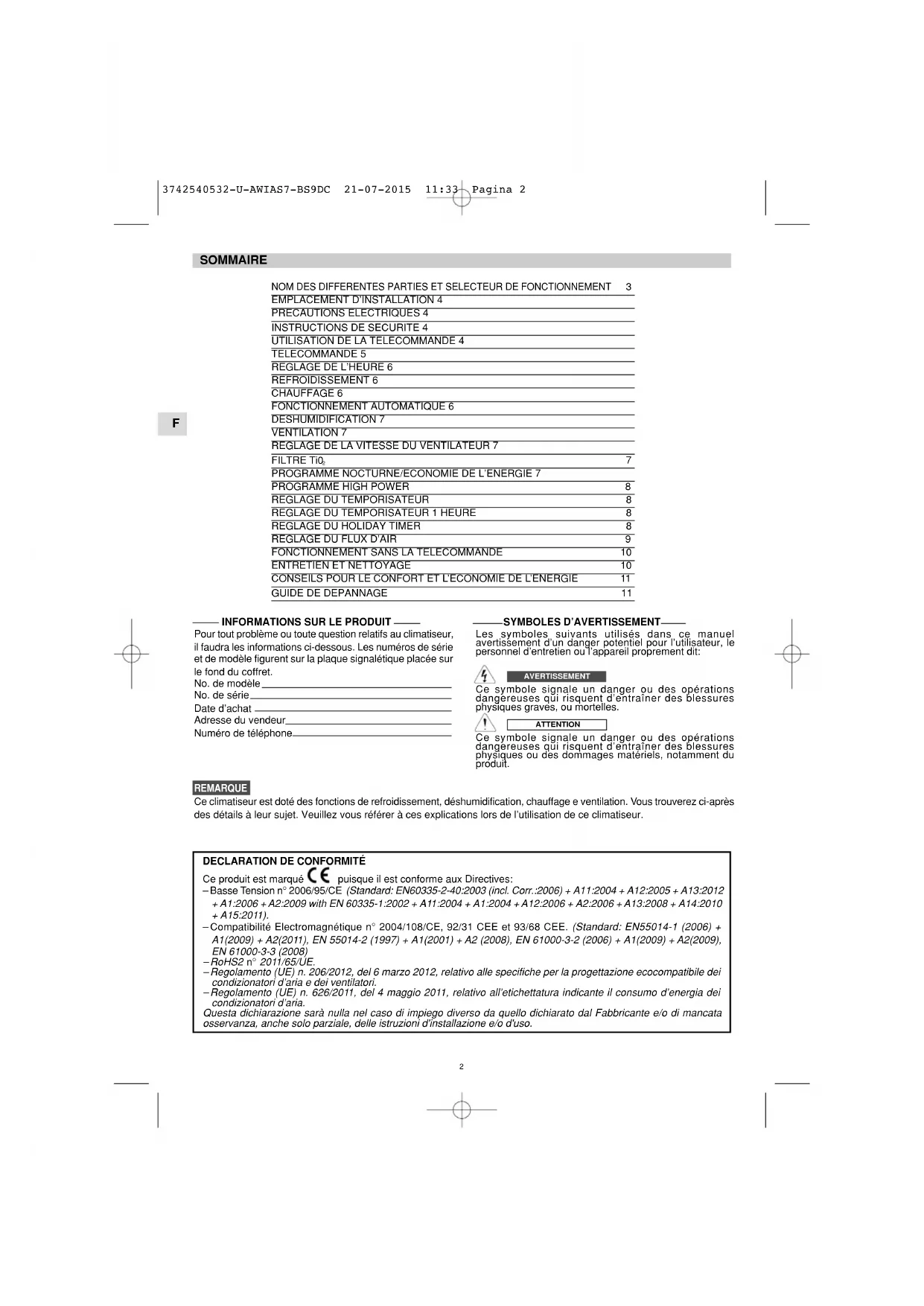 Ce climatiseur est doté des fonctions de refroidissement, déshumidification, chauffage e ventilation. Vous trouverez ci-après des détails à leur sujet. Veuillez vous référer à ces explications lors de l’utilisation de ce climatiseur. SOMMAIRE REMARQUE Pour tout problème ou toute question relatifs au climatiseur, il faudra les informations ci-dessous. Les numéros de série et de modèle figurent sur la plaque signalétique placée sur le fond du coffret. No. de modèle No. de série Date d’achat Adresse du vendeur Numéro de téléphone