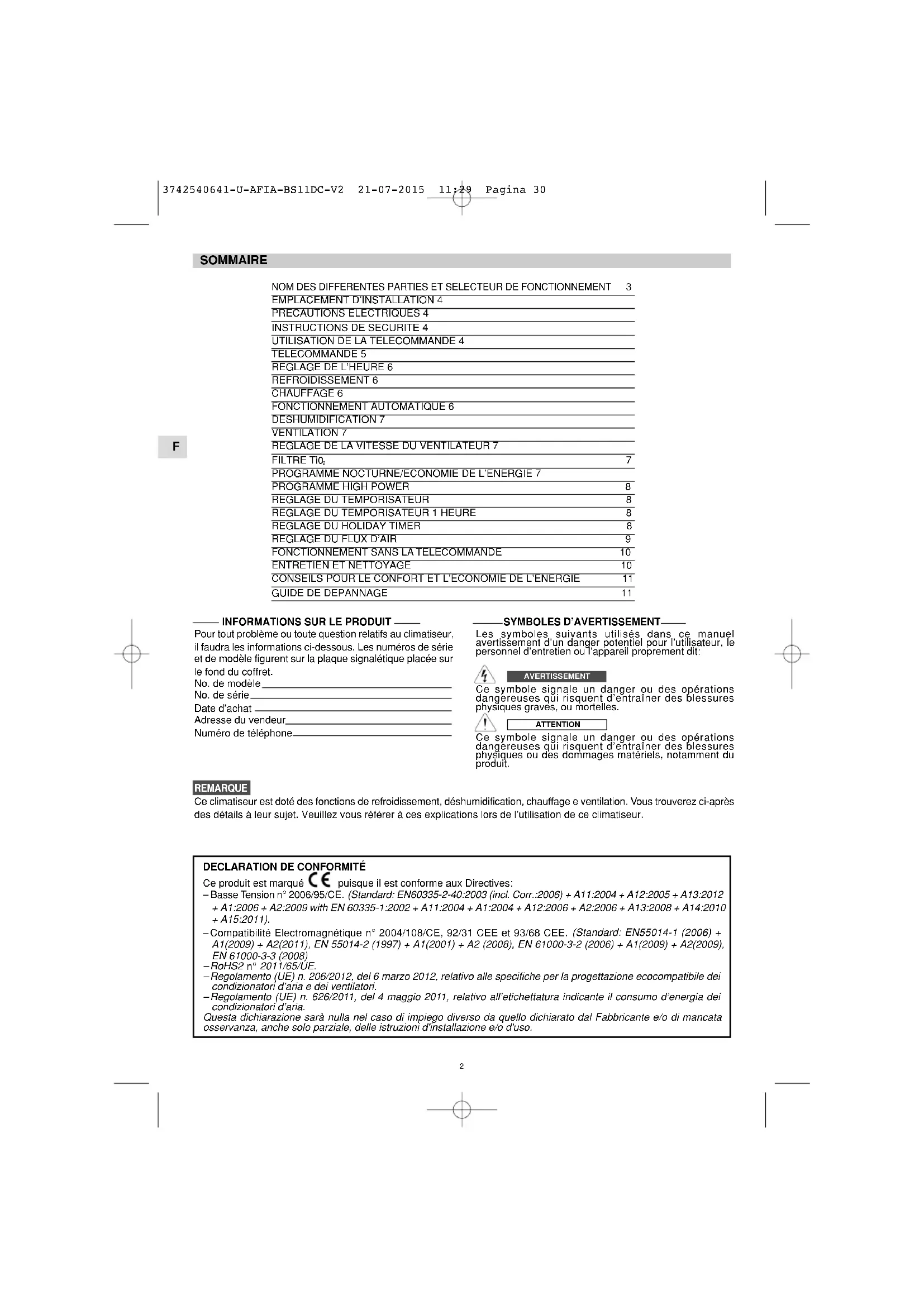 Ce climatiseur est doté des fonctions de refroidissement, déshumidification, chauffage e ventilation. Vous trouverez ci-après des détails à leur sujet. Veuillez vous référer à ces explications lors de l’utilisation de ce climatiseur. SOMMAIRE