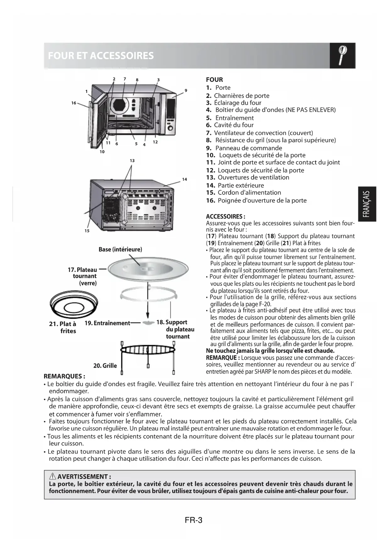 ACCESSOIRES : Assurez-vous que les accessoires suivants sont bien four- nis avec le four : (17) Plateau tournant (18) Support du plateau tournant (19) Entraînement (20) Grille (21) Plat à frites