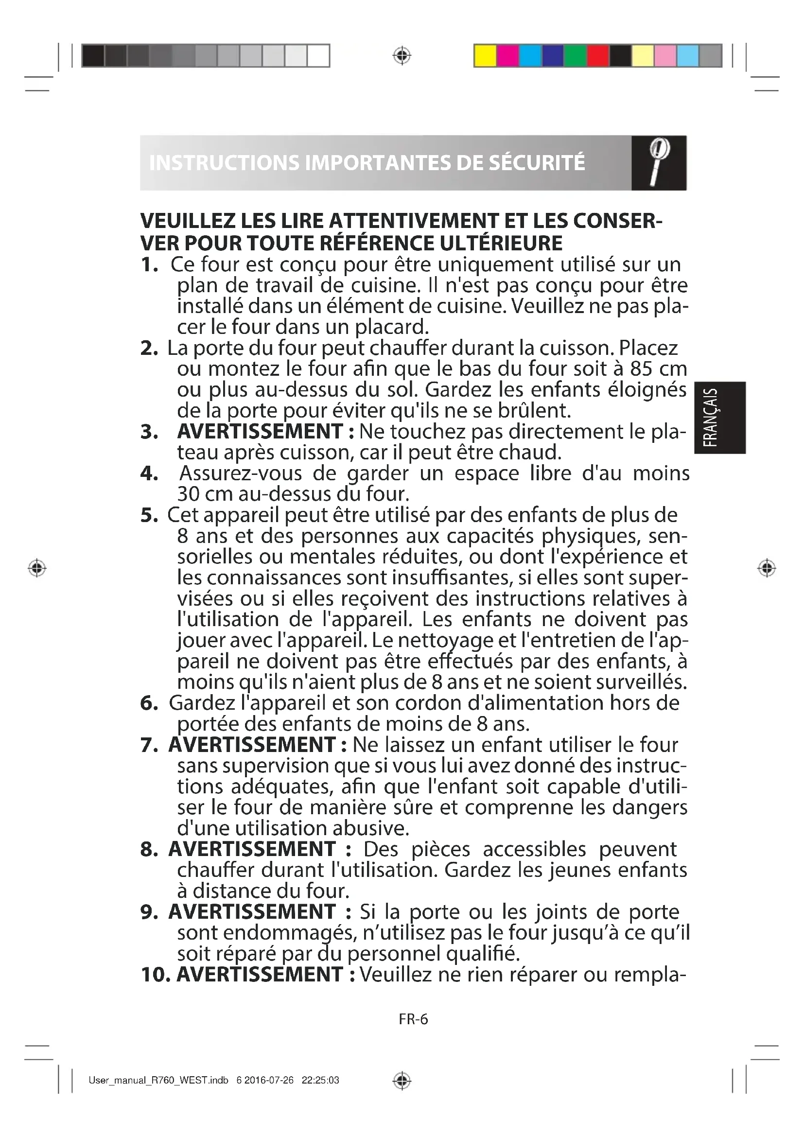 éviter de vous brûler, utilisez toujours d'épais gants de cuisine anti-chaleur pour four. Lorsque vous réchauf- fez un plat dans un récipient en plastique ou en papier, surveillez le four pour prévenir tout risque d'incendie. User_manual_R760_WEST.indb 7 2016-07-26 22:25:03FR-8 FRANÇAIS