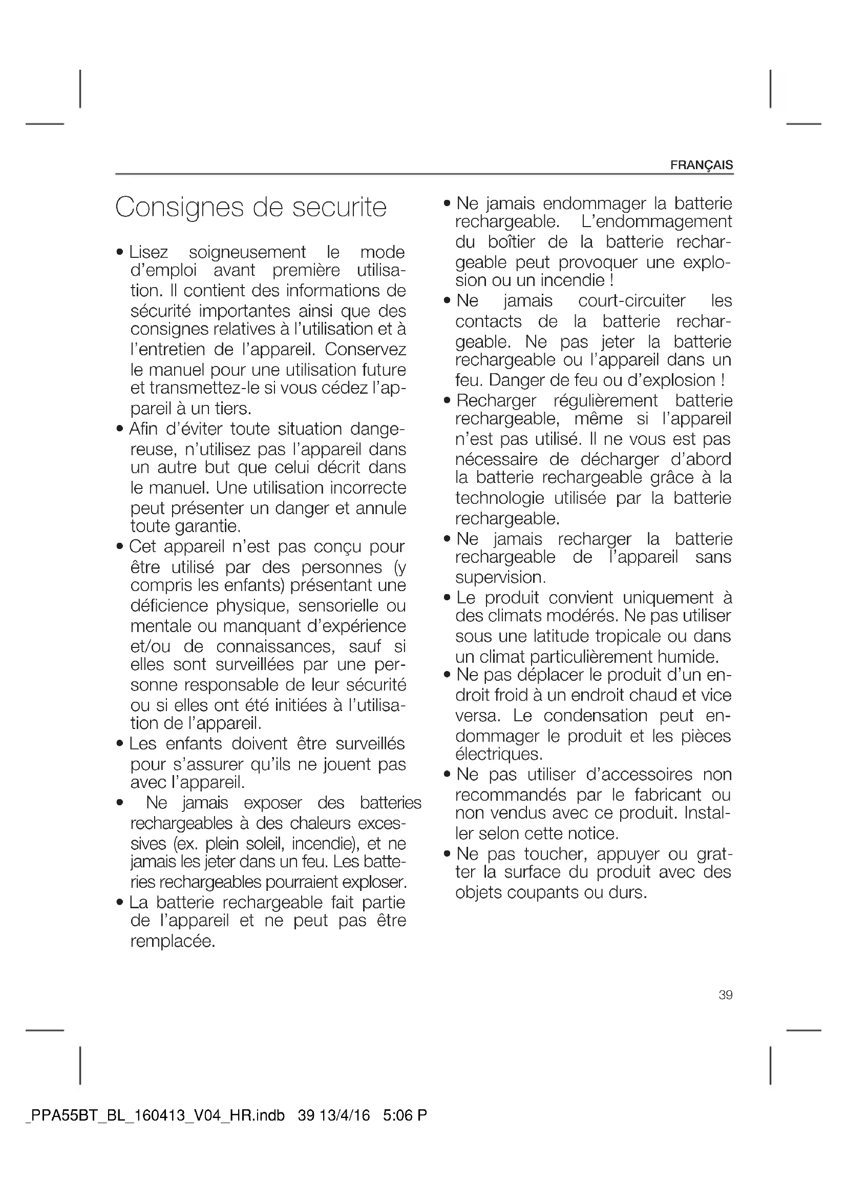 - Ne pas toucher, appuyer ou grat- ter la surface du produit avec des objets coupants ou durs. IM_PPA55BT_BL_160413_V04_HR.indb 39 13/4/16 5:06 PMFRANÇAIS