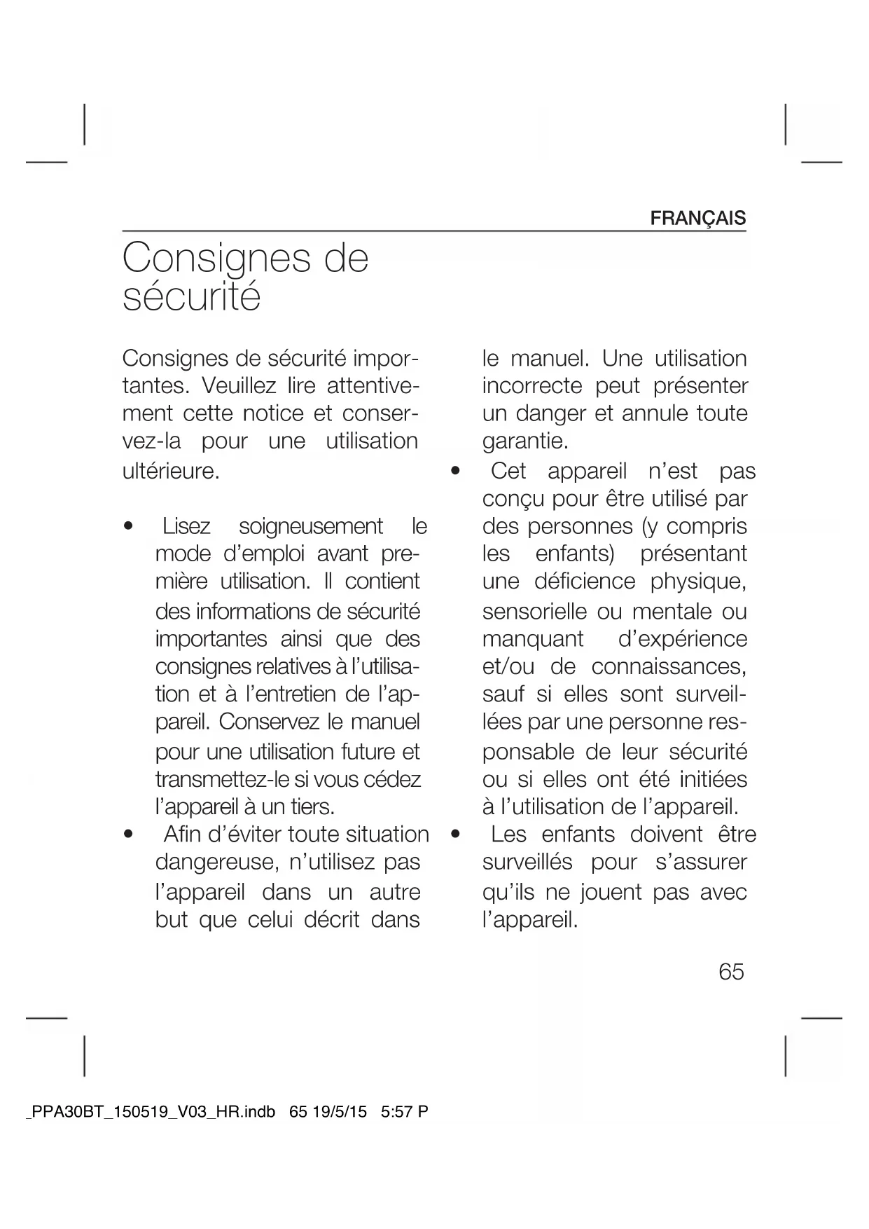 - Les enfants doivent être surveillés pour s’assurer qu’ils ne jouent pas avec l’appareil. IM_PPA30BT_150519_V03_HR.indb 65 19/5/15 5:57 PMFRANÇAIS