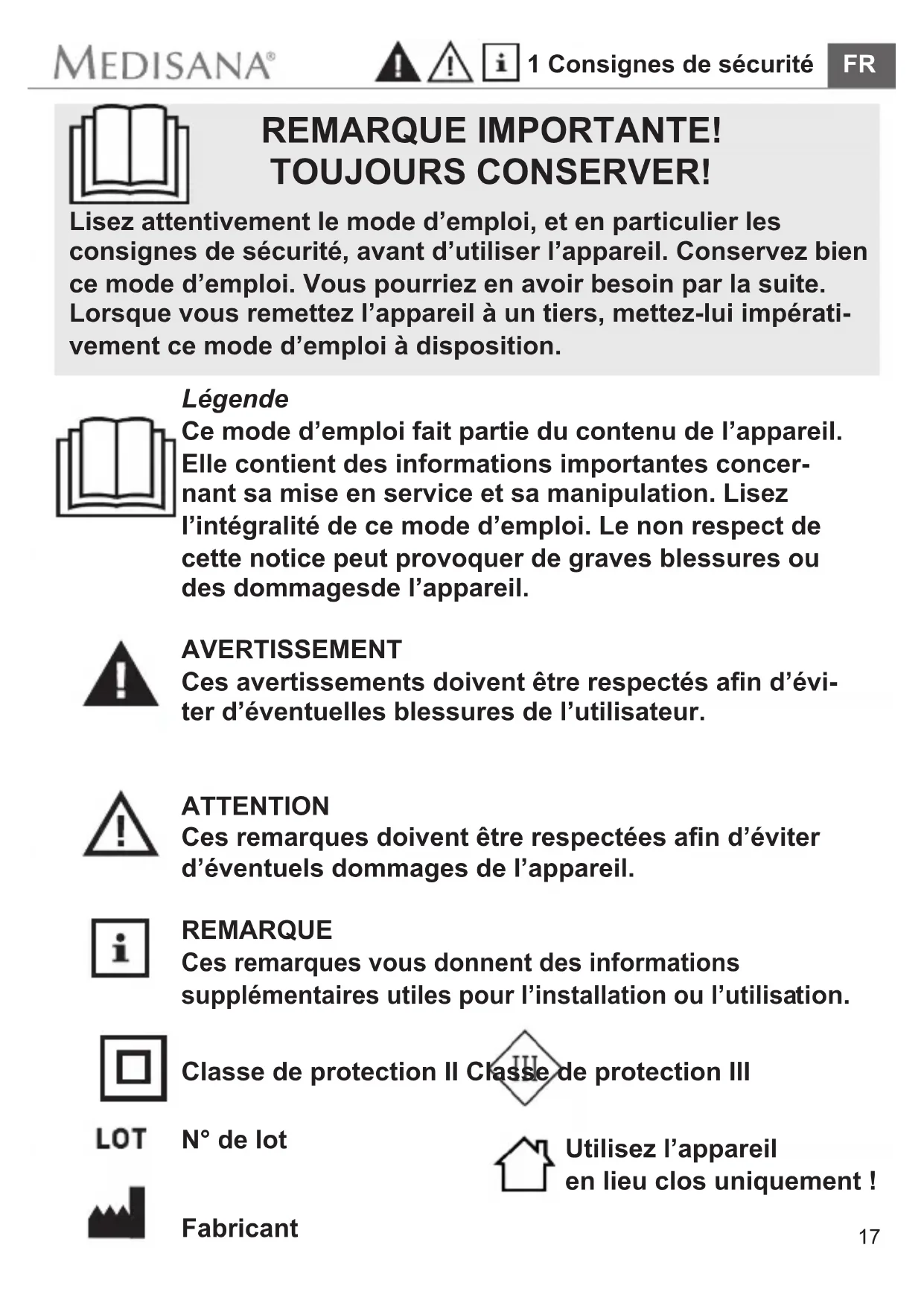 Légende Ce mode d’emploi fait partie du contenu de l’appareil. Elle contient des informations importantes concer- nant sa mise en service et sa manipulation. Lisez l’intégralité de ce mode d’emploi. Le non respect de cette notice peut provoquer de graves blessures ou des dommagesde l’appareil. AVERTISSEMENT Ces avertissements doivent être respectés an d’évi- ter d’éventuelles blessures de l’utilisateur. ATTENTION Ces remarques doivent être respectées an d’éviter d’éventuels dommages de l’appareil. REMARQUE Ces remarques vous donnent des informations supplémentaires utiles pour l’installation ou l’utilisa tion. N° de lot Fabricant REMARQUE IMPORTANTE! TOUJOURS CONSERVER! Lisez attentivement le mode d’emploi, et en particulier les consignes de sécurité, avant d’utiliser l’appareil. Conservez bien ce mode d’emploi. Vous pourriez en avoir besoin par la suite. Lorsque vous remettez l’appareil à un tiers, mettez-lui impérati- vement ce mode d’emploi à disposition. Classe de protection II Classe de protection III Utilisez l’appareil en lieu clos uniquement !18
