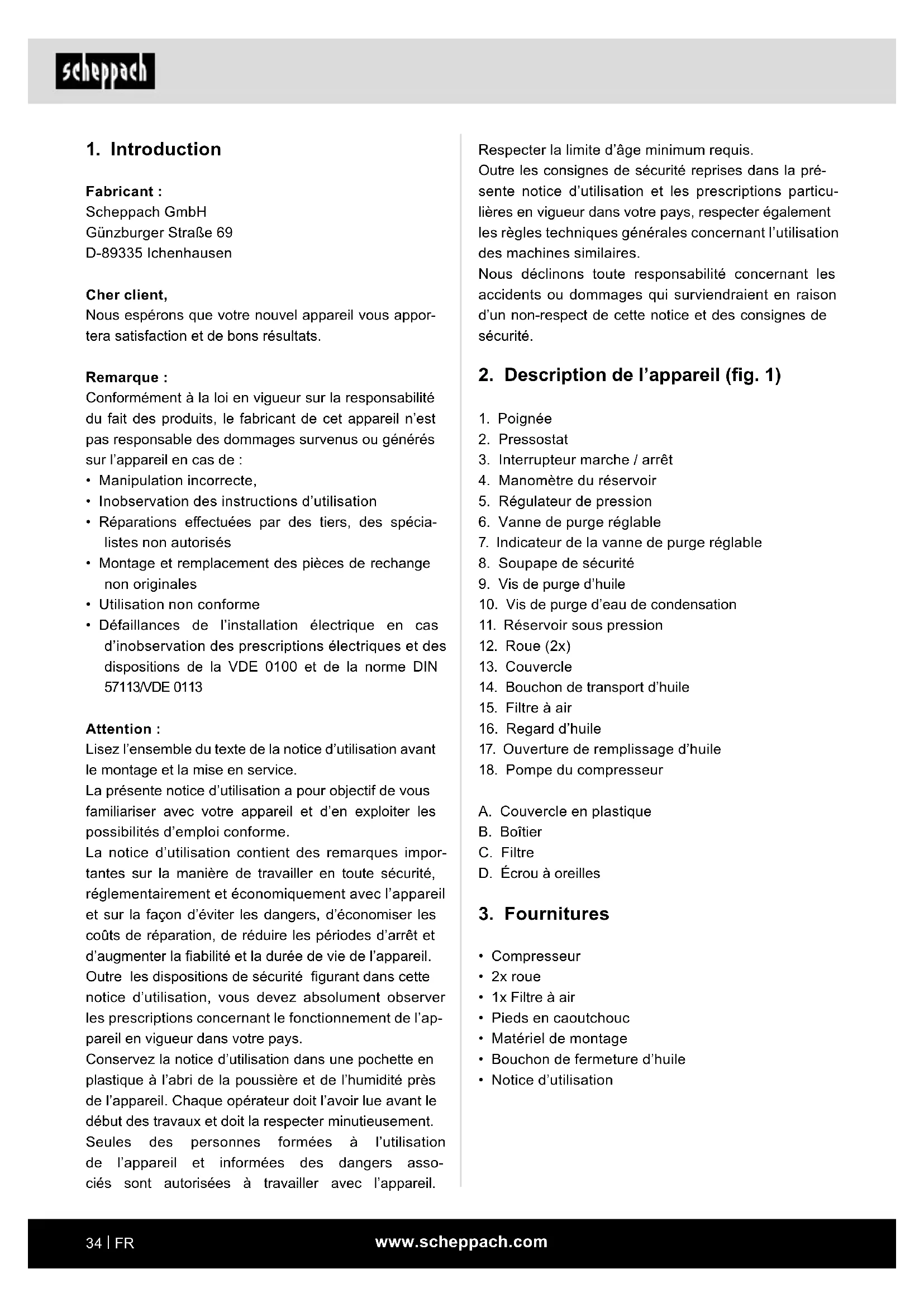 Fabricant : Scheppach GmbH Günzburger Straße 69 D-89335 Ichenhausen Cher client, Nous espérons que votre nouvel appareil vous appor- tera satisfaction et de bons résultats. Remarque : Conformément à la loi en vigueur sur la responsabilité du fait des produits, le fabricant de cet appareil n’est pas responsable des dommages survenus ou générés sur l’appareil en cas de :