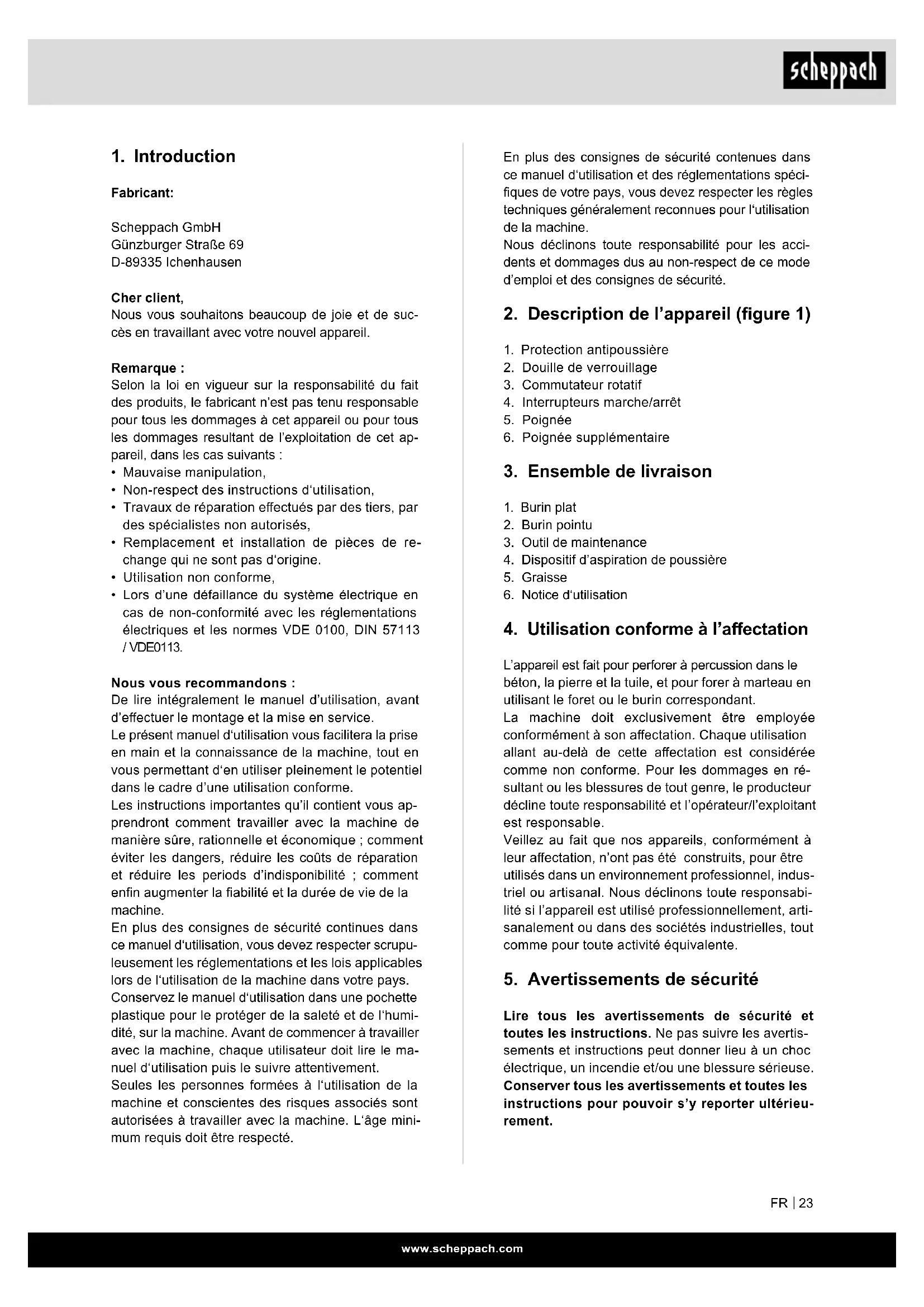 Lire tous les avertissements de sécurité et toutes les instructions. Ne pas suivre les avertis- sements et instructions peut donner lieu à un choc électrique, un incendie et/ou une blessure sérieuse. Conserver tous les avertissements et toutes les instructions pour pouvoir s’y reporter ultérieu- rement.www.scheppach.com