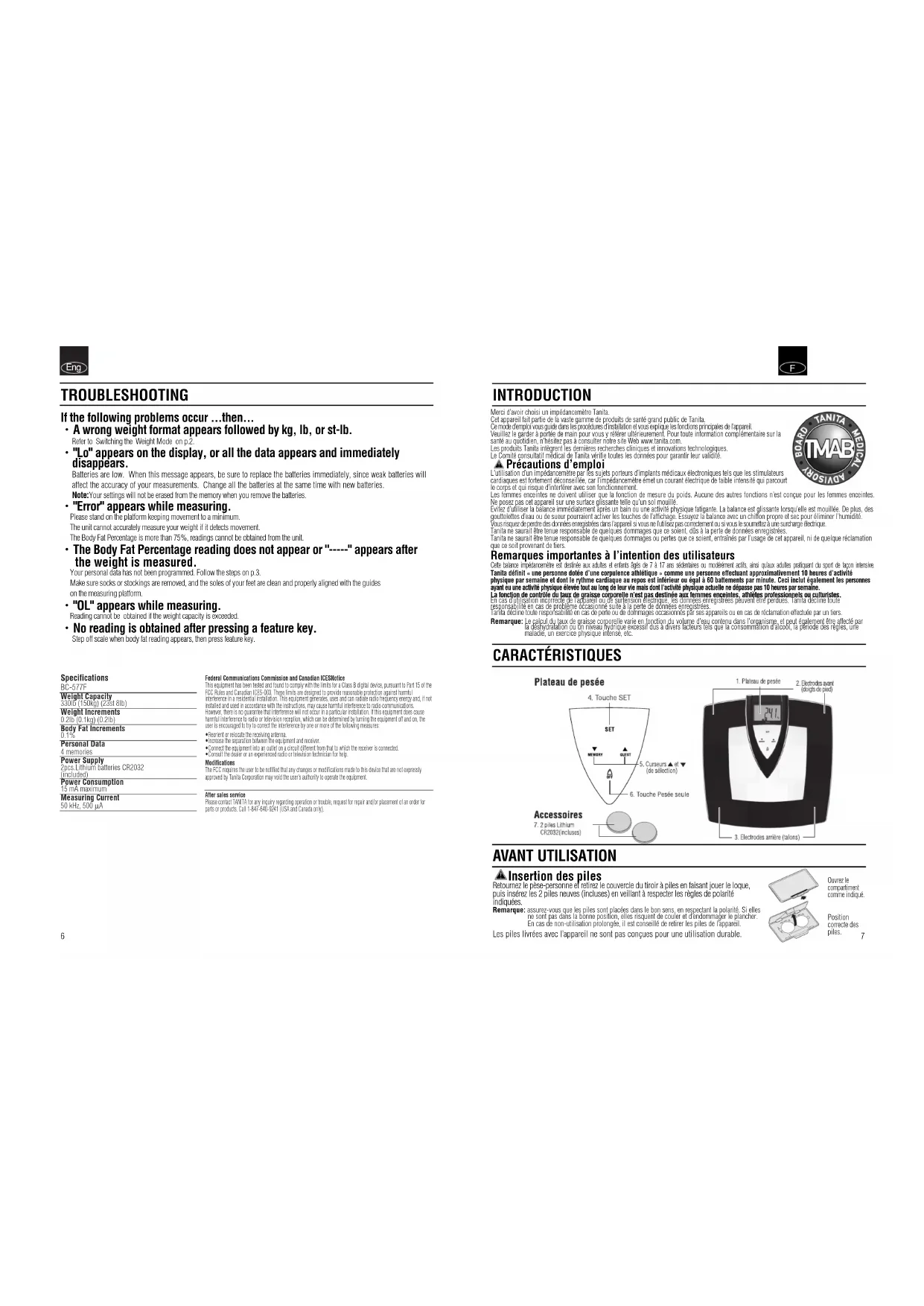 Retrouvez gratuitement la notice de l'appareil BC577F TANITA au format PDF.