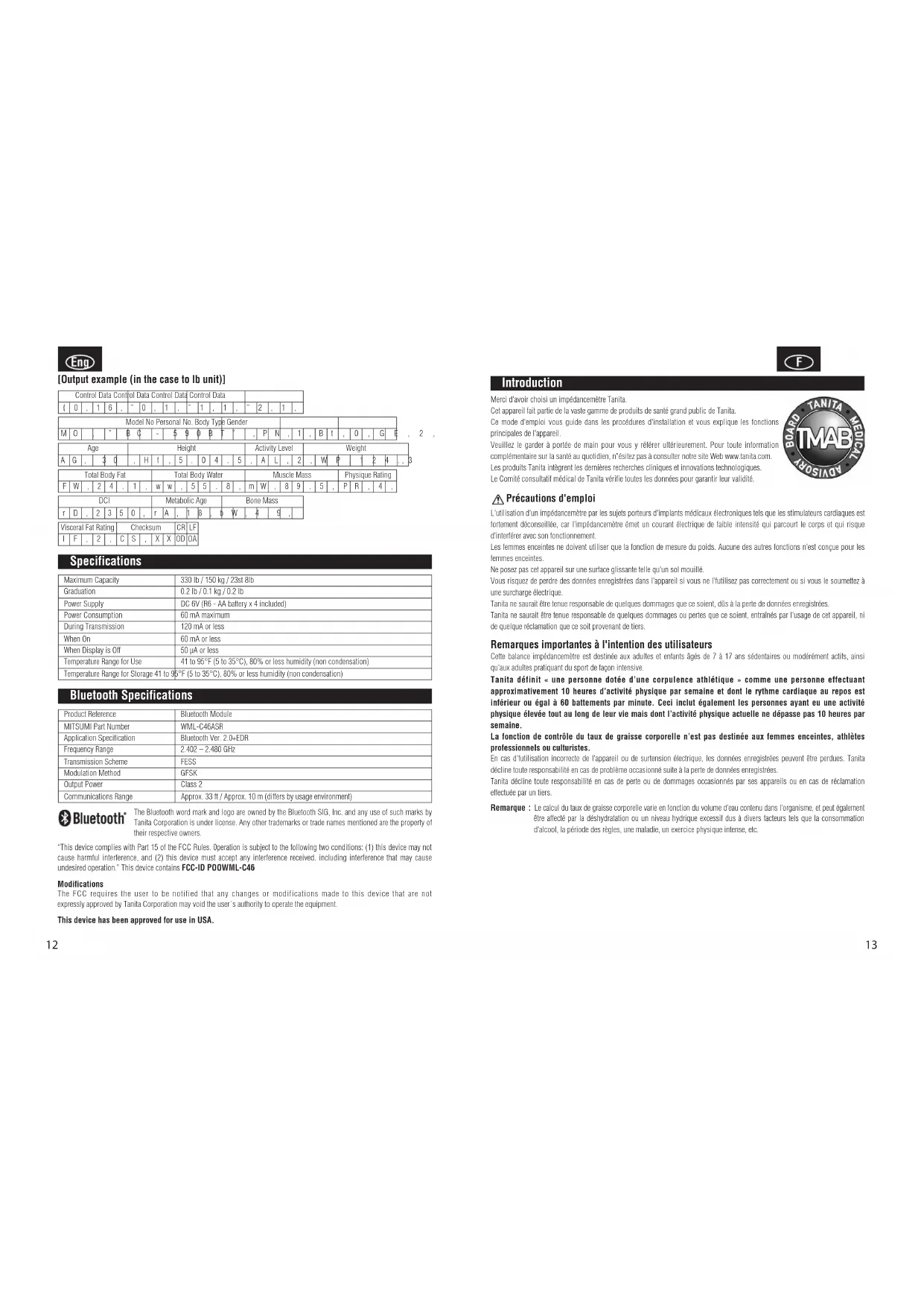 Age Height Activity Level Weight AG, 30 ,Hf ,5.04.5,AL,2,WP,124.3 Specifications “This device complies with Part 15 of the FCC Rules. 0peration is subject to the following two conditions: (1) this device may not cause harmful interference, and (2) this device must accept any interference received. including interference that may cause undesired operation.” This device contains FCC-ID POOWML-C46 Modifications The FCC requires the user to be notified that any changes or modifications made to this device that are not expressly approved by Tanita Corporation may void the user´s authority to operate the equipment. This device has been approved for use in USA. Maximum Capacity 330 lb / 150 kg / 23st 8lb Graduation 0.2 lb / 0.1 kg / 0.2 lb Power Supply DC 6V (R6 - AA battery x 4 included) Power Consumption 60 mA maximum During Transmission 120 mA or less When On 60 mA or less When Display is Off 50 µA or less Temperature Range for Use 41 to 95°F (5 to 35°C), 80% or less humidity (non condensation) Temperature Range for Storage 41 to 95°F (5 to 35°C), 80% or less humidity (non condensation) Product Reference Bluetooth Module MITSUMI Part Number WML-C46ASR Application Specification Bluetooth Ver. 2.0+EDR Frequency Range 2.402 – 2.480 GHz Transmission Scheme FESS Modulation Method GFSK Output Power Class 2 Communications Range Approx. 33 ft / Approx. 10 m (differs by usage environment) Bluetooth Specifications The Bluetooth word mark and logo are owned by the Bluetooth SIG, Inc. and any use of such marks by Tanita Corporation is under license. Any other trademarks or trade names mentioned are the property of their respective owners. Visceral Fat Rating Introduction Merci d'avoir choisi un impédancemètre Tanita. Cet appareil fait partie de la vaste gamme de produits de santé grand public de Tanita. Ce mode d'emploi vous guide dans les procédures d'installation et vous explique les fonctions principales de l'appareil. Veuillez le garder à portée de main pour vous y référer ultérieurement. Pour toute information complémentaire sur la santé au quotidien, n"ésitez pas à consulter notre site Web www.tanita.com. Les produits Tanita intègrent les dernières recherches cliniques et innovations technologiques. Le Comité consultatif médical de Tanita vérifie toutes les données pour garantir leur validité. Précautions d'emploi L'utilisation d'un impédancemètre par les sujets porteurs d'implants médicaux électroniques tels que les stimulateurs cardiaques est fortement déconseillée, car l’impédancemètre émet un courant électrique de faible intensité qui parcourt le corps et qui risque d’interférer avec son fonctionnement. Les femmes enceintes ne doivent utiliser que la fonction de mesure du poids. Aucune des autres fonctions n'est conçue pour les femmes enceintes. Ne posez pas cet appareil sur une surface glissante telle qu'un sol mouillé. Vous risquez de perdre des données enregistrées dans l'appareil si vous ne l'futilisez pas correctement ou si vous le soumettez à une surcharge électrique. Tanita ne saurait être tenue responsable de quelques dommages que ce soient, dûs à la perte de données enregistrées. Tanita ne saurait être tenue responsable de quelques dommages ou pertes que ce soient, entraînés par l'usage de cet appareil, ni de quelque réclamation que ce soit provenant de tiers. Remarques importantes à l'intention des utilisateurs Cette balance impédancemètre est destinée aux adultes et enfants âgés de 7 à 17 ans sédentaires ou modérément actifs, ainsi qu'aux adultes pratiquant du sport de façon intensive. Tanita définit « une personne dotée d’une corpulence athlétique » comme une personne effectuant approximativement 10 heures d’activité physique par semaine et dont le rythme cardiaque au repos est inférieur ou égal à 60 battements par minute. Ceci inclut également les personnes ayant eu une activité physique élevée tout au long de leur vie mais dont l’activité physique actuelle ne dépasse pas 10 heures par semaine. La fonction de contrôle du taux de graisse corporelle n’est pas destinée aux femmes enceintes, athlètes professionnels ou culturistes. En cas d'futilisation incorrecte de l'appareil ou de surtension électrique, les données enregistrées peuvent être perdues. Tanita décline toute responsabilité en cas de problème occasionné suite à la perte de données enregistrées. Tanita décline toute responsabilité en cas de perte ou de dommages occasionnés par ses appareils ou en cas de réclamation effectuée par un tiers. Remarque : Le calcul du taux de graisse corporelle varie en fonction du volume d'eau contenu dans l'organisme, et peut également être affecté par la déshydratation ou un niveau hydrique excessif dus à divers facteurs tels que la consommation d'alcool, la période des règles, une maladie, un exercice physique intense, etc.1514 Comment obtenir des résultats exacts Remarque : les mesures ne sont valides que si vos pieds sont propres et secs, que vos genoux ne sont pas pliés et que vous n’êtes pas assis. Talons centrés sur les électrodes. Les orteils peuvent dépasser du plateau. Fonction d’arrêt automatique La fonction d’arrêt automatique éteind l'fappareil dans les cas suivants :