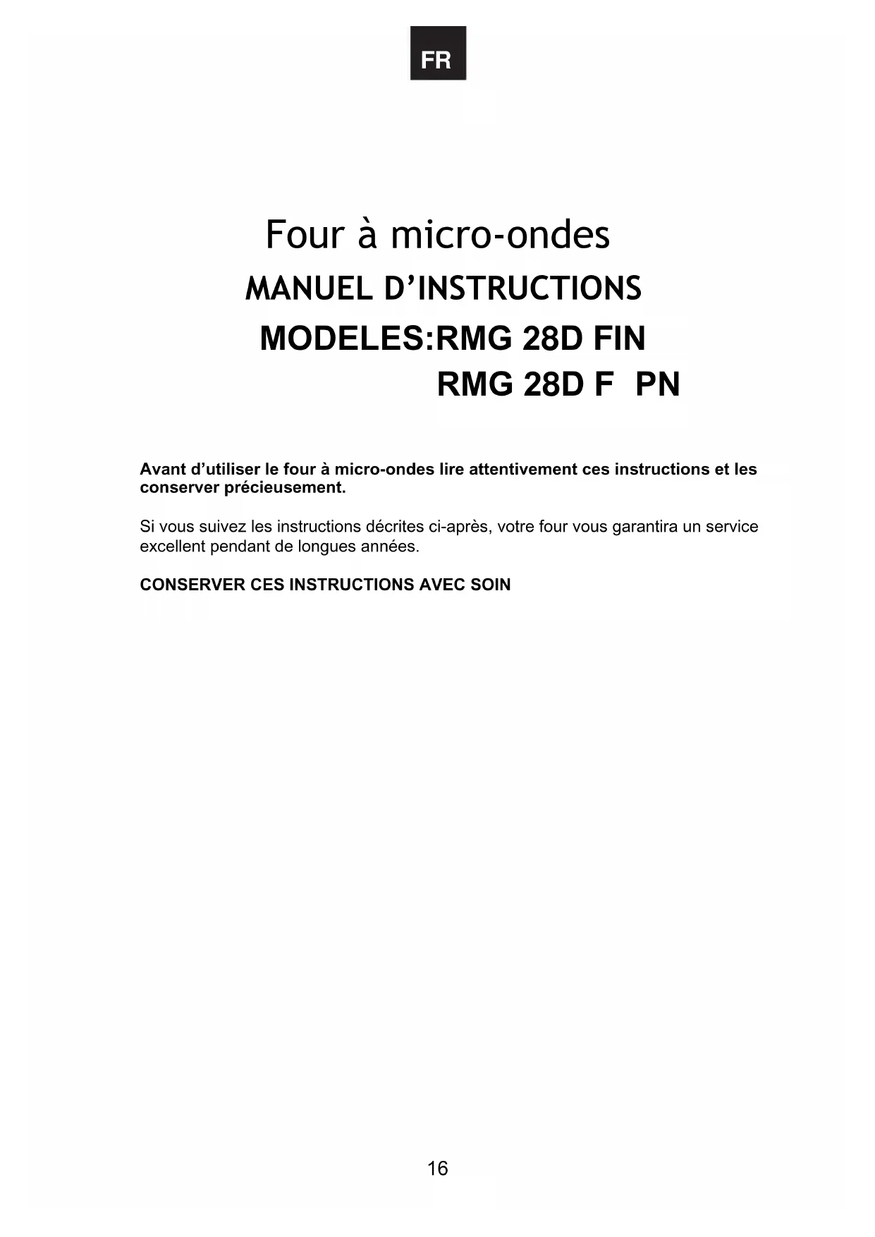 Modèles RMG 28D FIN/RMG 28D FPNAVVERTISSEMENTS IMPORTANTS POUR VOTRE SECURITE ATTENTION Afin de diminuer le risque d’incendie, court-circuit, dommages aux personnes ou exposition excessive à l’énergie des micro-ondes durant l’utilisation de l’appareil, nous vous conseillons de suivre les précautions de base suivantes: