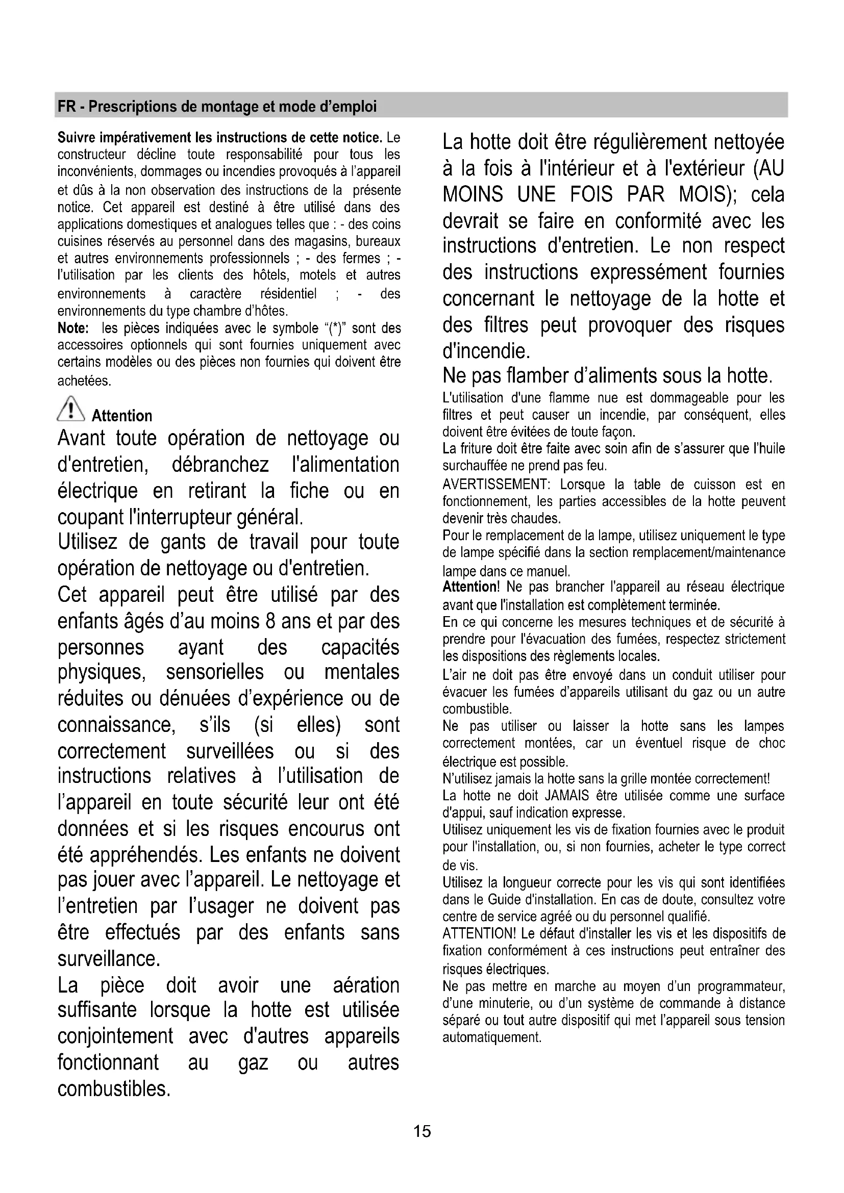 - CEM : EN 55014-1 ; CISPR 14-1 ; EN 55014-2 ; CISPR 14-2 ; EN/CEI 61000-3-2 ; EN/CEI 61000-3-3. Suggestions pour une utilisation correcte afin de réduire l’impact environnemental : Allumer la hotte à la vitesse minimum pendant la cuisson et la laisser fonctionner pendant quelques minutes après la fin de la cuisson. Augmenter la vitesse uniquement en présence d’une grande quantité de fumée ou de vapeur et n’utiliser la/les vitesse(s) accélérées que dans les cas extrêmes. Remplacer le(s) filtre(s) au charbon lorsque cela est nécessaire afin de maintenir une réduction efficace des odeurs. Nettoyer le(s) filtres à graisse lorsque cela est nécessaire afin de maintenir un filtrage efficace des graisses. Utiliser un système de tuyauterie du diamètre maximum indiqué dans ce manuel afin d’optimiser le rendement et de minimiser le bruit. En appliquant la marque sur ce produit, nous déclarons, sous notre responsabilité, le respect des exigences européennes en matière de sécurité, santé et environnement établies par la loi pour ce produit. Utilisation La hotte est réalisée de façon qu’elle puisse être utilisée en version aspirante à évacuation extérieure, ou filtrante à recyclage intérieur. Version aspirante La hotte est fournie avec une sortie d’air supérieure B1 et en option une sortie arrière B2*, prévue pour l’évacuation des fumées vers l’extérieur. Selon la solution retenue, appliquer la bride C fournie, boucher dans tous les cas le trou inutilisé avec le bouchon D* fourni. Remarque: sur certains modèles, le trou supérieur B1 est fourni fermé: Appuyer fermement pour détacher la partie perforée qui ferme le trou d’évacuation et l’enlever. Attention! La partie perforée ne peut être remise à sa place, effectuer cette opération uniquement si l’on est sur du type d’installation à effectuer. Attention! Sur certains modèles, le trou de sortie arrière n’est pas directement accessible, meme en retirant le bouchon (lorsque celui-ci est monté d’origine). Dans ce cas, retirer la pièce en plastique E1 ou E2 qui obstrue le trou a l’aide d’une pince coupante. Controler que le selecteur mode aspirant/filtrant (situé a l’intérieur de la hotte) G est en position aspirante (A). Version recyclage Dans le cas où il est impossible d’évacuer vers l’extérieur les fumées et vapeurs de cuisson, vous pouvez alors utiliser la hotte en version filtrante en montant le filtre a charbon. Les fumées et vapeurs seront recyclées à travers la grille avant située au dessus du panneau de commandes. Controler que le selecteur mode aspirant/filtrant (situé a l’intérieur de la hotte) G est en position filtrante (F). Les modèles sans moteur d’aspiration fonctionnent uniquement dans la version aspirante et ils doivent être connectés à une unité périphérique d’aspiration (non fournie). Les instructions de raccordement sont fournies avec l’unité périphérique d’aspiration. Installation La distance minimum entre la superficie de support des récipients sur le dispositif de cuisson et la partie la plus basse de la hotte de cuisine ne doit pas être inférieure à 60cm dans le cas de cuisinières électriques et de 75cm dans le cas de cuisinières à gaz ou mixtes. Si les instructions d’installation du dispositif de cuisson au gaz spécifient une plus grande distance, il faut en tenir compte. Branchement électrique La tension électrique doit correspondre à la tension reportée sur la plaque signalétique située à l’intérieur de la hotte. Si une prise est présente, branchez la hotte dans une prise murale conforme aux normes en vigueur et placée dans une zone accessible également après l’installation. Si aucune prise n’est présente (raccordement direct au circuit17 électrique), ou si la prise ne se trouve pas dans une zone accessible également après l’installation, appliquez un disjoncteur normalisé pour assurer de débrancher complètement la hotte du circuit électrique en conditions de catégorie surtension III, conformément aux règlementations de montage. Attention! Avant de rebrancher le circuit de la hotte à l’alimentation électrique et d’en vérifier le fonctionnement correct, contrôlez toujours que le câble d’alimentation soit monté correctement. Attention! Si le câble d’alimentation est endommagé, il doit être remplacé par le fabricant, son service après-vente ou des personnes de qualification similaire afin d’éviter un danger. Montage La hotte peut etre installée sur un mur ou sur le fond d’un meuble; s’il est fourni, utiliser le gabarit de pose H de facon a percer correctement les trous, sinon, appuyer la hotte sur le mur ou sur le fond du meuble et à l’aide d’un crayon noir, repérer l’endroit où percer les trous. Fixation murale -Inserer les chevilles J dans les trous et les 2 vis K dans les trous supérieurs. Retirer la grille et accrocher la hotte aux 2 vis, ensuite, depuis l’intérieur, positionner la troisième vis L enfin serrer toutes les vis. Fixation sous un meuble - Fixer la hotte avec les 4 vis M à l’intérieur du meuble. Fonctionnement La hotte est équipée d’un panneau de contrôle doté d’une commande de vitesse d’aspiration et d’une commande d’éclairage du plan de cuisson. Dégager le panneau frontal N*. Si votre produit est fourni avec une valve à actionnement électrique ou mécanique, les touches et/ou les boutons et/ou les poignées à disposition servent au contrôle des lumières et à l'ouverture et la fermeture de la valve. Entretien Nettoyage Pour le nettoyage, utiliser EXCLUSIVEMENT un chiffon humidifié avec des détersifs liquides neutres. NE PAS