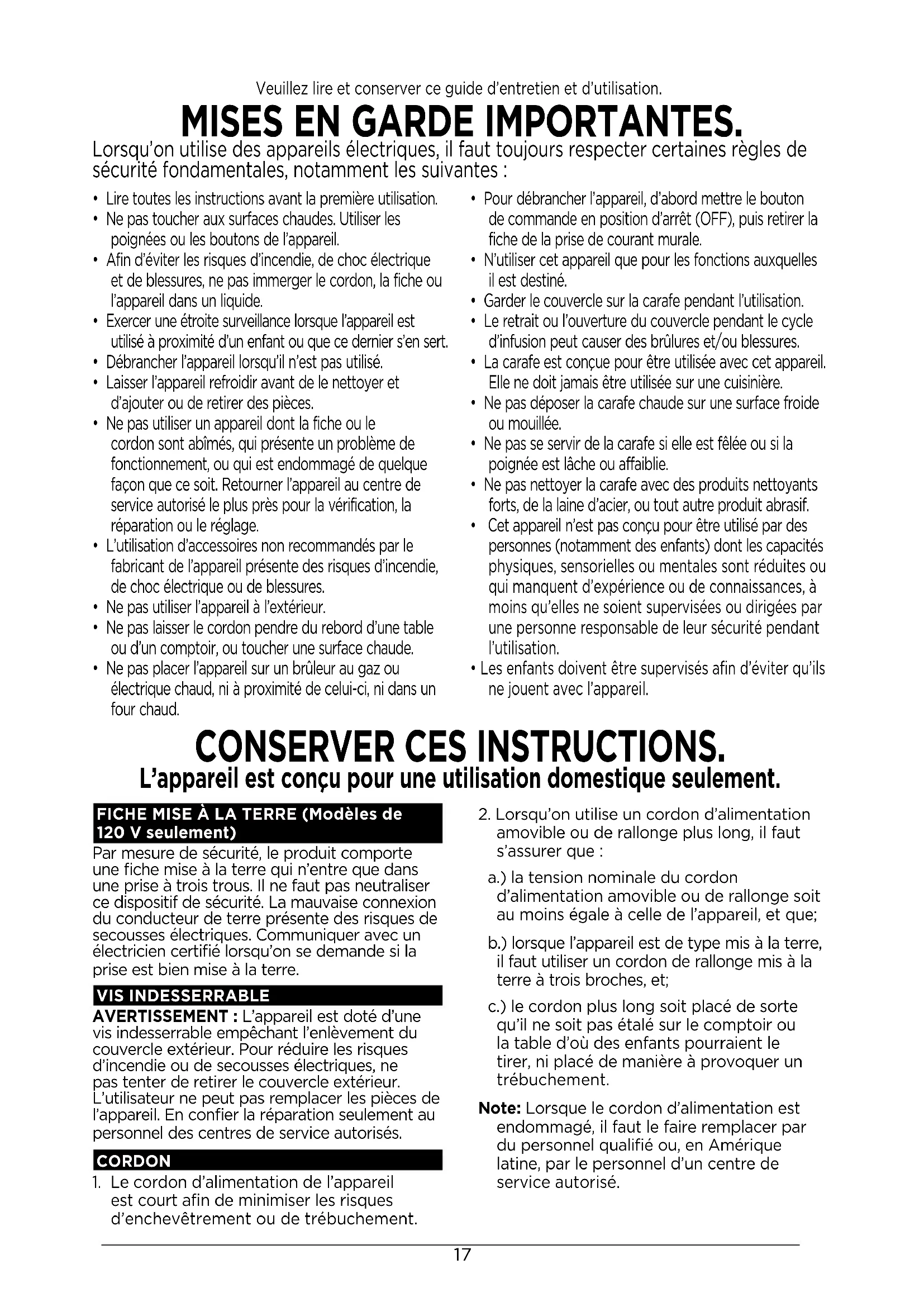 - Les enfants doivent être supervisés afin d’éviter qu’ils ne jouent avec l’appareil. FICHE MISE À LA TERRE (Modèles de 120 V seulement)Par mesure de sécurité, le produit comporte une fiche mise à la terre qui n’entre que dans une prise à trois trous. Il ne faut pas neutraliser ce dispositif de sécurité. La mauvaise connexion du conducteur de terre présente des risques de secousses électriques. Communiquer avec un électricien certifié lorsqu’on se demande si la prise est bien mise à la terre.VIS INDESSERRABLEAVERTISSEMENT : L’appareil est doté d’une vis indesserrable empêchant l’enlèvement du couvercle extérieur. Pour réduire les risques d’incendie ou de secousses électriques, ne pas tenter de retirer le couvercle extérieur. L’utilisateur ne peut pas remplacer les pièces de l’appareil. En confier la réparation seulement au personnel des centres de service autorisés.CORDON1. Le cordon d’alimentation de l’appareil est court afin de minimiser les risques d’enchevêtrement ou de trébuchement.2. Lorsqu’on utilise un cordon d’alimentation amovible ou de rallonge plus long, il faut s’assurer que : a.) la tension nominale du cordon d’alimentation amovible ou de rallonge soit au moins égale à celle de l’appareil, et que; b.) lorsque l’appareil est de type mis à la terre, il faut utiliser un cordon de rallonge mis à la terre à trois broches, et; c.) le cordon plus long soit placé de sorte qu’il ne soit pas étalé sur le comptoir ou la table d’où des enfants pourraient le tirer, ni placé de manière à provoquer un trébuchement.Note: Lorsque le cordon d’alimentation est endommagé, il faut le faire remplacer par du personnel qualifié ou, en Amérique latine, par le personnel d’un centre de service autorisé. Veuillez lire et conserver ce guide d’entretien et d’utilisation. MISES EN GARDE IMPORTANTES. Lorsqu’on utilise des appareils électriques, il faut toujours respecter certaines règles de sécurité fondamentales, notamment les suivantes : CONSERVER CES INSTRUCTIONS. L’appareil est conçu pour une utilisation domestique seulement.18 MATIÈRES BIENVENUE! Félicitations pour votre achat de moulin à café à meules Black & Decker! Nous avons élaboré ce guide pour assurer le rendement optimal du produit, et votre entière satisfaction. Conserver ce guide d’utilisation et d’entretien, et assurez- vous d’inscrire votre appareil en ligne au www.prodprotect.com/applica. CONSERVER CES INSTRUCTIONS. L’appareil est conçu pour une utilisation domestique seulement. Mises en Garde Importantes ......................................... 17 Table des Matiéres..................................................18 Familiarisation Avec le Moulin à Café à Meules...........................19 Avant d’utiliser le moulin à café ...................................... 20 Pour effectuer la mouture........................................... 20 Lignes directrices pour effectuer la mouture ............................21 Entretien et Nettoyage ..............................................21 Dépannage....................................................... 22 Information sur la Garantie et le Service à la Clientèle ................... 2319