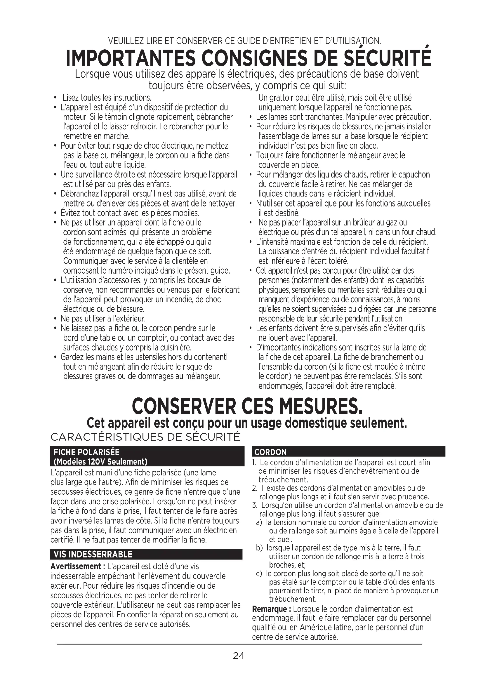 - D’importantes indications sont inscrites sur la lame de la fiche de cet appareil. La fiche de branchement ou l’ensemble du cordon (si la fiche est moulée à même le cordon) ne peuvent pas être remplacés. S’ils sont endommagés, l’appareil doit être remplacé. FICHE POLARISÉE (Modéles 120V Seulement)L’appareil est muni d’une fiche polarisée (une lame plus large que l’autre). Afin de minimiser les risques de secousses électriques, ce genre de fiche n’entre que d’une façon dans une prise polarisée. Lorsqu’on ne peut insérer la fiche à fond dans la prise, il faut tenter de le faire après avoir inversé les lames de côté. Si la fiche n’entre toujours pas dans la prise, il faut communiquer avec un électricien certifié. Il ne faut pas tenter de modifier la fiche. VIS INDESSERRABLE Avertissement : L’appareil est doté d’une vis indesserrable empêchant l’enlèvement du couvercle extérieur. Pour réduire les risques d’incendie ou de secousses électriques, ne pas tenter de retirer le couvercle extérieur. L’utilisateur ne peut pas remplacer les pièces de l’appareil. En confier la réparation seulement au personnel des centres de service autorisés.CORDON1. Le cordon d’alimentation de l’appareil est court afin de minimiser les risques d’enchevêtrement ou de trébuchement.2. Il existe des cordons d’alimentation amovibles ou de rallonge plus longs et il faut s’en servir avec prudence.3. Lorsqu’on utilise un cordon d’alimentation amovible ou de rallonge plus long, il faut s’assurer que: a) la tension nominale du cordon d’alimentation amovible ou de rallonge soit au moins égale à celle de l’appareil, et que;. b) lorsque l’appareil est de type mis à la terre, il faut utiliser un cordon de rallonge mis à la terre à trois broches, et; c) le cordon plus long soit placé de sorte qu’il ne soit pas étalé sur le comptoir ou la table d’où des enfants pourraient le tirer, ni placé de manière à provoquer un trébuchement.Remarque : Lorsque le cordon d’alimentation est endommagé, il faut le faire remplacer par du personnel qualifié ou, en Amérique latine, par le personnel d’un centre de service autorisé. CONSERVER CES MESURES. Cet appareil est conçu pour un usage domestique seulement. VEUILLEZ LIRE ET CONSERVER CE GUIDE D’ENTRETIEN ET D’UTILISATION.