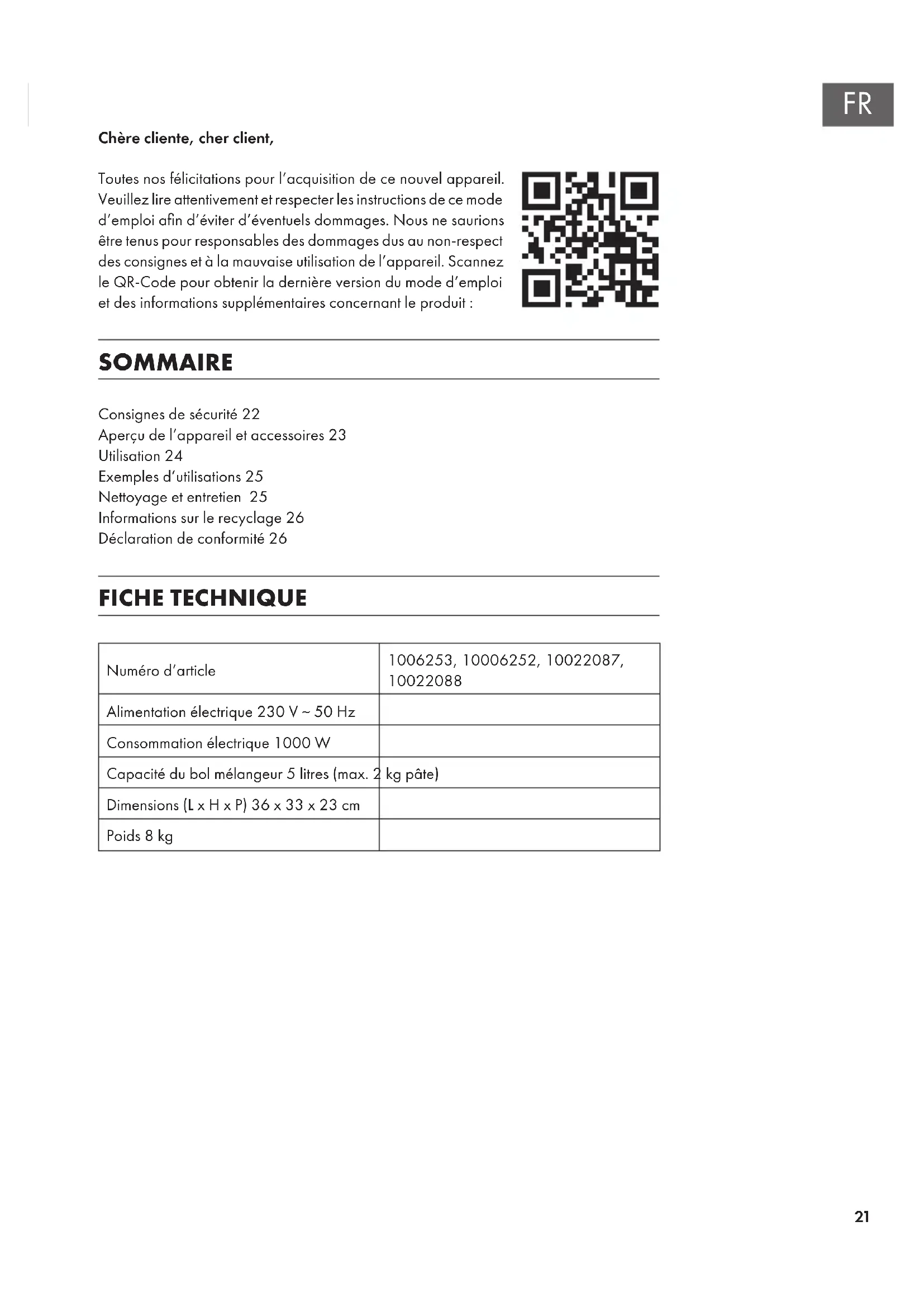 Chère cliente, cher client, Toutes nos félicitations pour l’acquisition de ce nouvel appareil. Veuillez lire attentivement et respecter les instructions de ce mode d’emploi an d’éviter d’éventuels dommages. Nous ne saurions être tenus pour responsables des dommages dus au non-respect des consignes et à la mauvaise utilisation de l’appareil. Scannez le QR-Code pour obtenir la dernière version du mode d‘emploi et des informations supplémentaires concernant le produit : SOMMAIRE Consignes de sécurité22 Aperçu de l’appareil et accessoires23 Utilisation24 Exemples d’utilisations25 Nettoyage et entretien 25 Informations sur le recyclage26 Déclaration de conformité26 FICHE TECHNIQUE Numéro d’article 1006253, 10006252, 10022087,