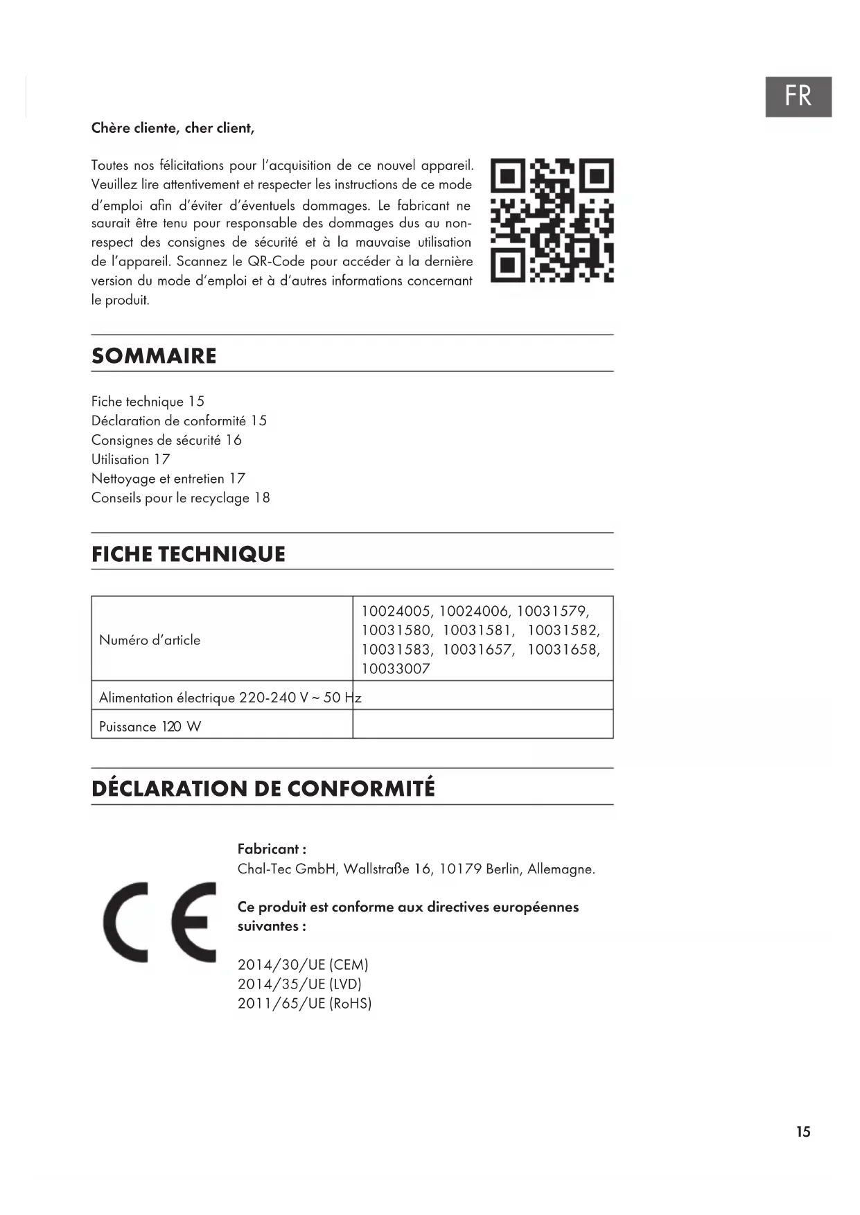 Fabricant : Chal-Tec GmbH, Wallstraße 16, 10179 Berlin, Allemagne. Ce produit est conforme aux directives européennes suivantes : 2014/30/UE (CEM) 2014/35/UE (LVD) 2011/65/UE (RoHS) Fiche technique15 Déclaration de conformité15 Consignes de sécurité16 Utilisation17 Nettoyage et entretien17 Conseils pour le recyclage1816