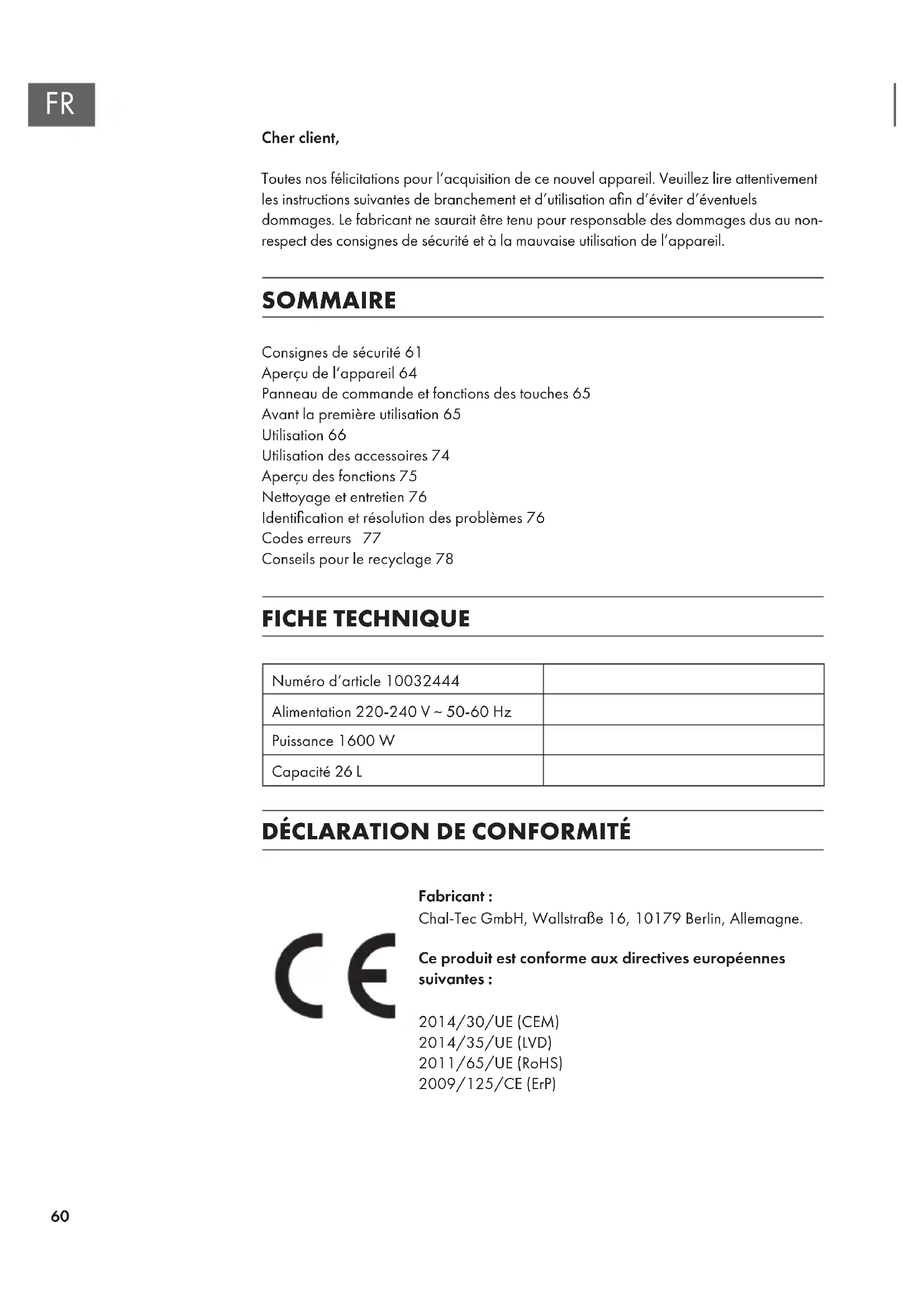 Cher client, Toutes nos félicitations pour l’acquisition de ce nouvel appareil. Veuillez lire attentivement les instructions suivantes de branchement et d’utilisation an d’éviter d’éventuels dommages. Le fabricant ne saurait être tenu pour responsable des dommages dus au non- respect des consignes de sécurité et à la mauvaise utilisation de l’appareil. SOMMAIRE Consignes de sécurité61 Aperçu de l‘appareil64 Panneau de commande et fonctions des touches65 Avant la première utilisation65 Utilisation66 Utilisation des accessoires74 Aperçu des fonctions75 Nettoyage et entretien76 Identication et résolution des problèmes76 Codes erreurs 77 Conseils pour le recyclage78 FICHE TECHNIQUE Numéro d’article 10032444 Alimentation 220-240 V ~ 50-60 Hz Puissance 1600 W Capacité 26 L
