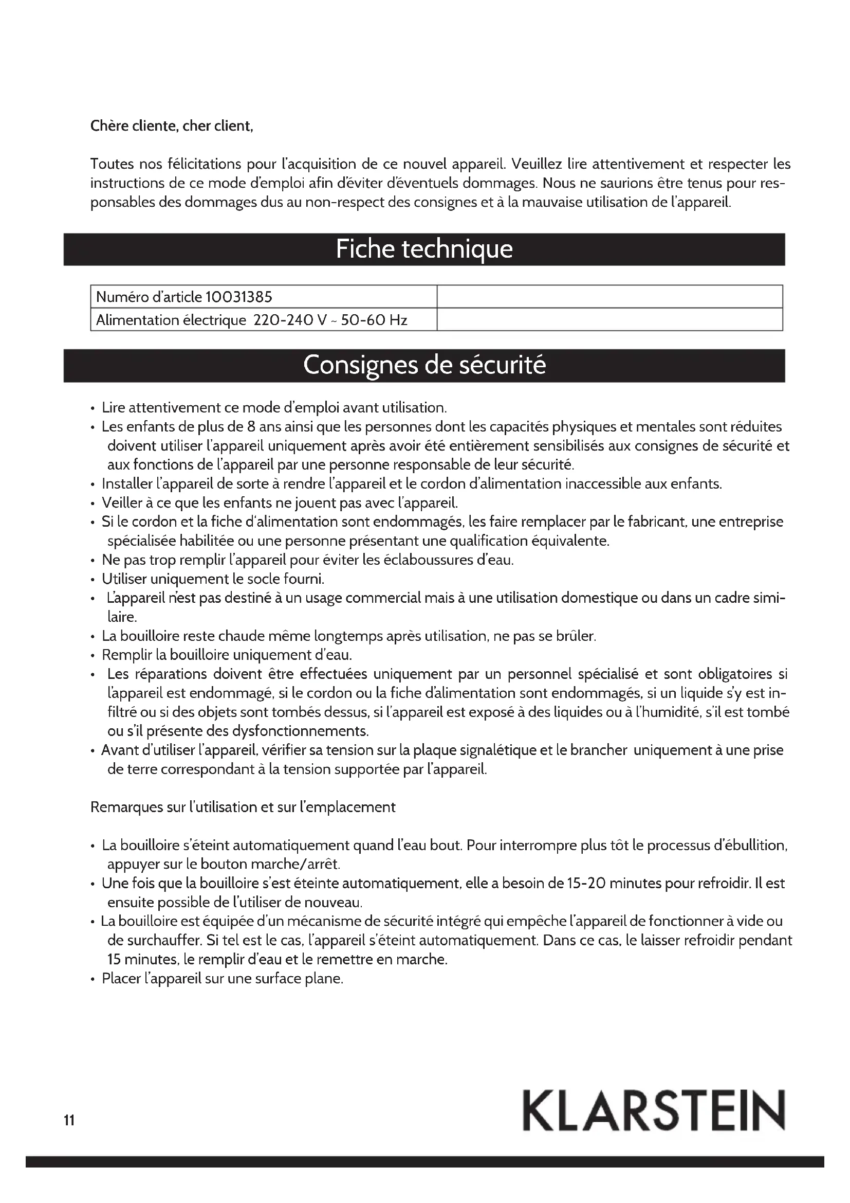 10031385 - Bouilloire Klarstein - Notice d'utilisation et mode d'emploi gratuit