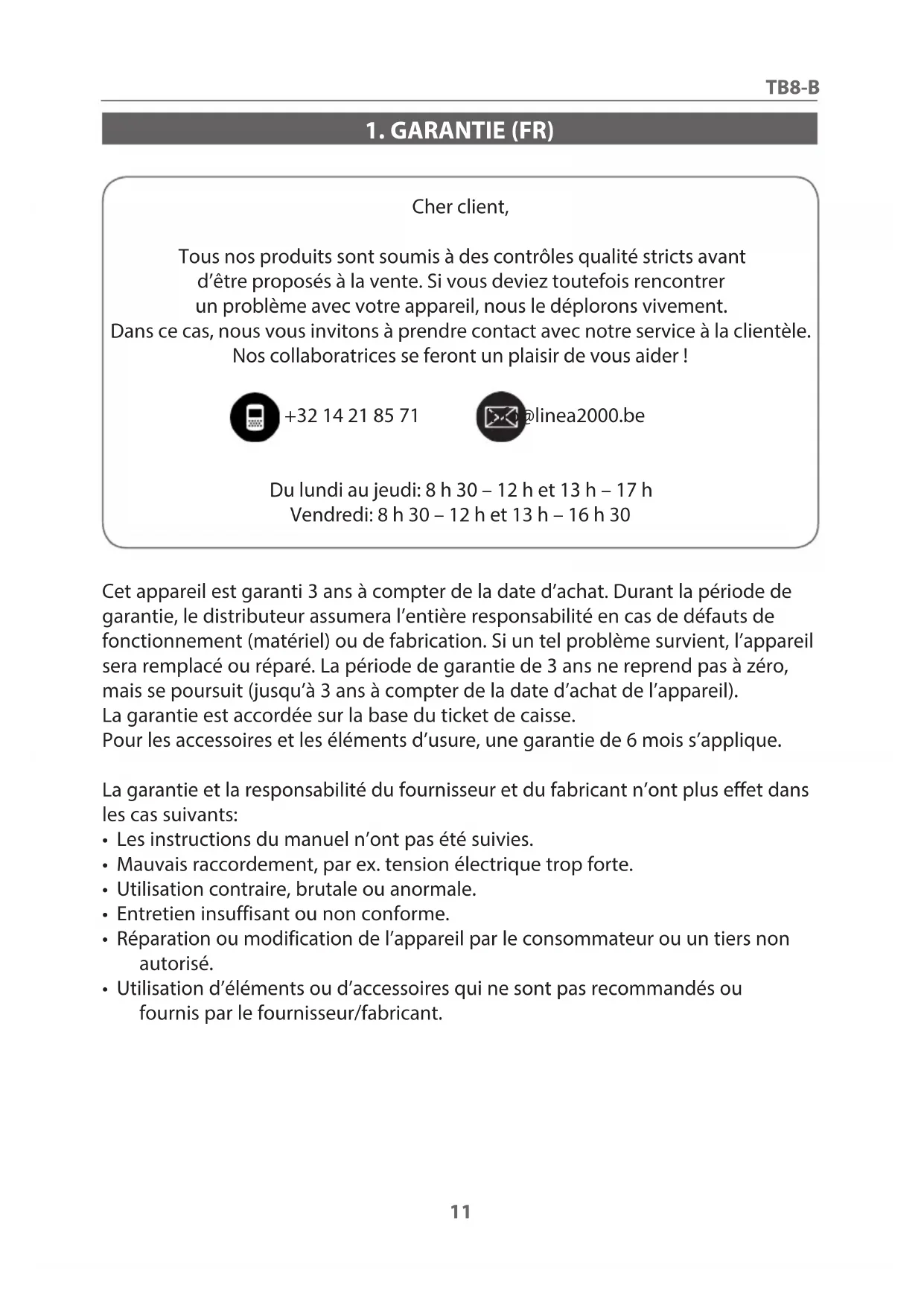 Cher client, Tous nos produits sont soumis à des contrôles qualité stricts avant d’être proposés à la vente. Si vous deviez toutefois rencontrer un problème avec votre appareil, nous le déplorons vivement. Dans ce cas, nous vous invitons à prendre contact avec notre service à la clientèle. Nos collaboratrices se feront un plaisir de vous aider ! +32 14 21 85 71 info@linea2000.be Du lundi au jeudi: 8 h 30 – 12 h et 13 h – 17 h Vendredi: 8 h 30 – 12 h et 13 h – 16 h 30 Cet appareil est garanti 3 ans à compter de la date d’achat. Durant la période de garantie, le distributeur assumera l’entière responsabilité en cas de défauts de fonctionnement (matériel) ou de fabrication. Si un tel problème survient, l’appareil sera remplacé ou réparé. La période de garantie de 3 ans ne reprend pas à zéro, mais se poursuit (jusqu’à 3 ans à compter de la date d’achat de l’appareil). La garantie est accordée sur la base du ticket de caisse. Pour les accessoires et les éléments d’usure, une garantie de 6 mois s’applique. La garantie et la responsabilité du fournisseur et du fabricant n’ont plus effet dans les cas suivants: