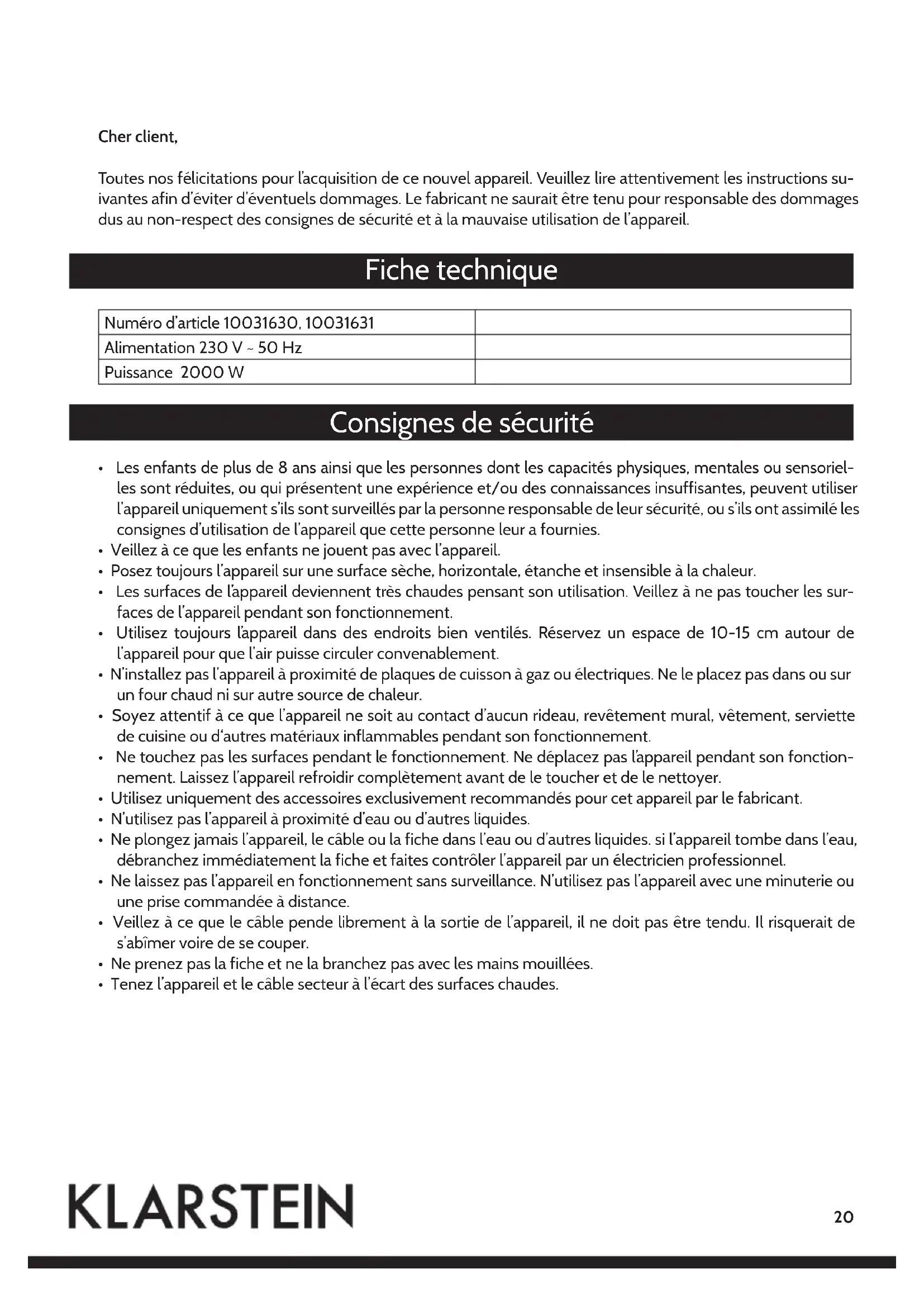 Retrouvez gratuitement la notice de l'appareil 10031630 Klarstein au format PDF.