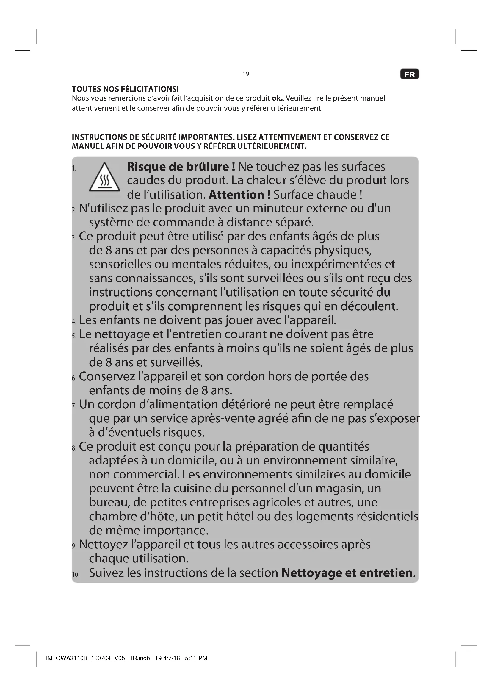 TOUTES NOS FÉLICITATIONS! Nous vous remercions d’avoir fait l’acquisition de ce produit ok.. Veuillez lire le présent manuel attentivement et le conserver an de pouvoir vous y référer ultérieurement. INSTRUCTIONS DE SÉCURITÉ IMPORTANTES. LISEZ ATTENTIVEMENT ET CONSERVEZ CE MANUEL AFIN DE POUVOIR VOUS Y RÉFÉRER ULTÉRIEUREMENT.