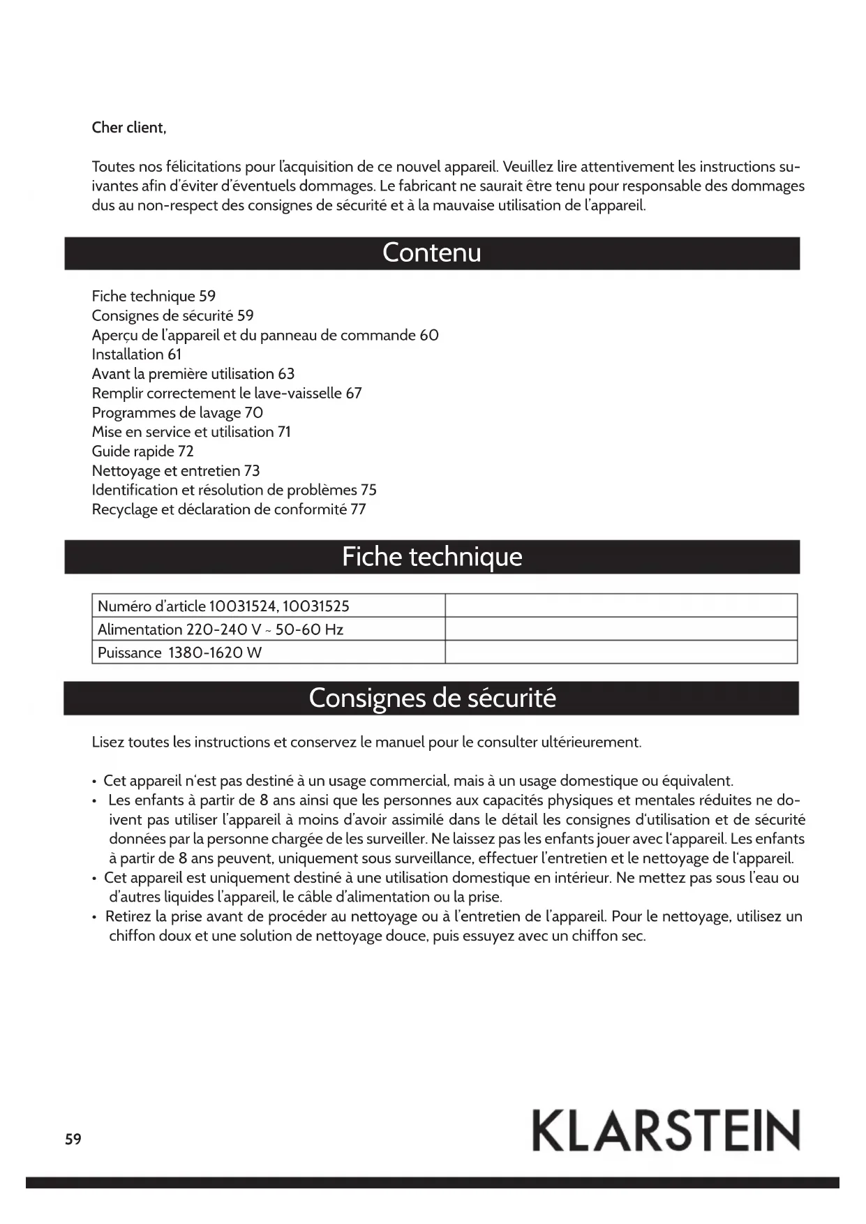 10031524 - Lave-vaisselle Klarstein - Notice d'utilisation et mode d'emploi gratuit