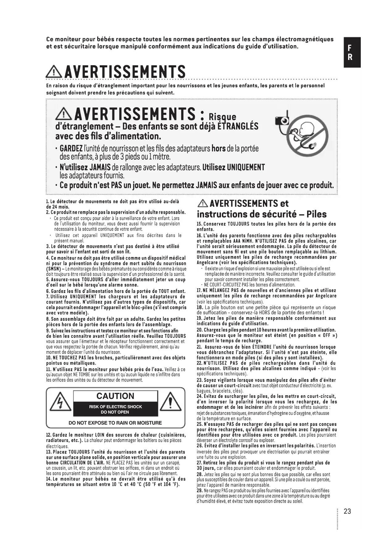 - ESPAGNOL AVERTISSEMENTS VEUILLEZ CONSERVER CE GUIDE D’UTILISATION POUR CONSULTATION ULTÉRIEURE. LISEZ ATTENTIVEMENT LES MISES EN GARDE ET LES INSTRUCTIONS DE SÉCURITÉ AVANT D’ASSEMBLER ET D'UTILISER CE PRODUIT. LE NON-RESPECT DES INSTRUCTIONS OU DE TOUT AVERTISSEMENT POURRAIT ENTRAÎNER DES BLESSURES GRAVES OU LA MORT, OU ENDOMMAGER CE PRODUIT. 241AC_Manuel_AC117_NA_m3.indd 22 18-03-02 09:20Ce moniteur pour bébés respecte toutes les normes pertinentes sur les champs électromagnétiques et est sécuritaire lorsque manipulé conformément aux indications du guide d’utilisation. AVERTISSEMENTS 1. Le détecteur de mouvements ne doit pas être utilisé au-delà de 24 mois. 2. Ce produit ne remplace pas la supervision d’un adulte responsable.• Ce produit est conçu pour aider à la surveillance de votre enfant. Lors de l’utilisation du moniteur, vous devez aussi fournir la supervision nécessaire à la sécurité continue de votre enfant. • Utilisez cet appareil UNIQUEMENT aux fins décrites dans le présent manuel. 3. Le détecteur de mouvements n’est pas destiné à être utilisé pour savoir si l’enfant est sorti de son lit. 4. Ce moniteur ne doit pas être utilisé comme un dispositif médical ni pour la prévention du syndrome de mort subite du nourrisson (SMSN) – Le monitorage des bébés prématurés ou considérés comme à risque doit toujours être réalisé sous la supervision d’un professionnel de la santé. 5. Assurez-vous TOUJOURS d’aller immédiatement jeter un coup d’oeil sur le bébé lorsqu’une alarme sonne.6. Gardez les fils d’alimentation hors de la portée de TOUT enfant.7. Utilisez UNIQUEMENT les chargeurs et les adaptateurs de courant fournis. N’utilisez pas d’autres types de dispositifs, car cela pourrait endommager l’appareil et le bloc-piles (s’il est compris avec votre modèle).8. Son assemblage doit être fait par un adulte. Gardez les petites pièces hors de la portée des enfants lors de l’assemblage. 9. Suivez les instructions et testez ce moniteur et ses fonctions afin de bien les connaître avant l’utilisation réelle. Veuillez TOUJOURS vous assurer que l’émetteur et le récepteur fonctionnent correctement et que vous respectez la portée de chacun. Vérifiez régulièrement, ainsi qu’au moment de déplacer l’unité du nourrisson.10. NE TOUCHEZ PAS les broches, particulièrement avec des objets pointus ou métalliques. p. 43