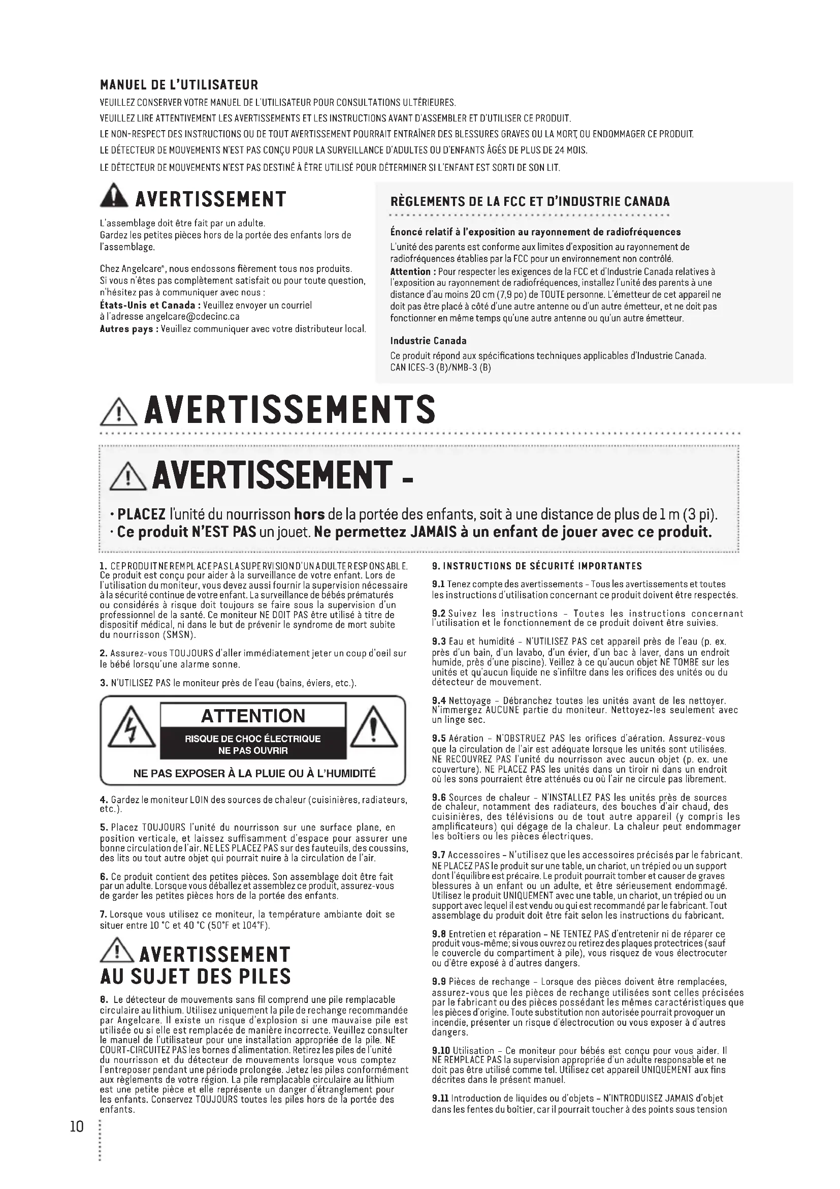 8. Le détecteur de mouvements sans fil comprend une pile remplacable circulaire au lithium. Utilisez uniquement la pile de rechange recommandée par Angelcare. Il existe un risque d’explosion si une mauvaise pile est utilisée ou si elle est remplacée de manière incorrecte. Veuillez consulter le manuel de l’utilisateur pour une installation appropriée de la pile. NE COURT-CIRCUITEZ PAS les bornes d’alimentation. Retirez les piles de l’unité du nourrisson et du détecteur de mouvements lorsque vous comptez l’entreposer pendant une période prolongée. Jetez les piles conformément aux règlements de votre région. La pile remplacable circulaire au lithium est une petite pièce et elle représente un danger d’étranglement pour les enfants. Conservez TOUJOURS toutes les piles hors de la portée des enfants.9. INSTRUCTIONS DE SÉCURITÉ IMPORTANTES9.1 Tenez compte des avertissements – Tous les avertissements et toutes les instructions d’utilisation concernant ce produit doivent être respectés.9.2 Suivez les instructions – Toutes les instructions concernant l’utilisation et le fonctionnement de ce produit doivent être suivies.9.3 Eau et humidité – N’UTILISEZ PAS cet appareil près de l’eau (p. ex. près d’un bain, d’un lavabo, d’un évier, d’un bac à laver, dans un endroit humide, près d’une piscine). Veillez à ce qu’aucun objet NE TOMBE sur les unités et qu’aucun liquide ne s’infiltre dans les orifices des unités ou du détecteur de mouvement.9.4 Nettoyage – Débranchez toutes les unités avant de les nettoyer. N’immergez AUCUNE partie du moniteur. Nettoyez-les seulement avec un linge sec.9.5 Aération – N’OBSTRUEZ PAS les orifices d’aération. Assurez-vous que la circulation de l’air est adéquate lorsque les unités sont utilisées. NE RECOUVREZ PAS l’unité du nourrisson avec aucun objet (p. ex. une couverture). NE PLACEZ PAS les unités dans un tiroir ni dans un endroit où les sons pourraient être atténués ou où l’air ne circule pas librement.9.6 Sources de chaleur – N’INSTALLEZ PAS les unités près de sources de chaleur, notamment des radiateurs, des bouches d’air chaud, des cuisinières, des télévisions ou de tout autre appareil (y compris les amplificateurs) qui dégage de la chaleur. La chaleur peut endommager les boîtiers ou les pièces électriques.9.7 Accessoires – N’utilisez que les accessoires précisés par le fabricant. NE PLACEZ PAS le produit sur une table, un chariot, un trépied ou un support dont l’équilibre est précaire. Le produit pourrait tomber et causer de graves blessures à un enfant ou un adulte, et être sérieusement endommagé. Utilisez le produit UNIQUEMENT avec une table, un chariot, un trépied ou un support avec lequel il est vendu ou qui est recommandé par le fabricant. Tout assemblage du produit doit être fait selon les instructions du fabricant.9.8 Entretien et réparation – NE TENTEZ PAS d’entretenir ni de réparer ce produit vous-même; si vous ouvrez ou retirez des plaques protectrices (sauf le couvercle du compartiment à pile), vous risquez de vous électrocuter ou d’être exposé à d’autres dangers.9.9 Pièces de rechange – Lorsque des pièces doivent être remplacées, assurez-vous que les pièces de rechange utilisées sont celles précisées par le fabricant ou des pièces possédant les mêmes caractéristiques que les pièces d’origine. Toute substitution non autorisée pourrait provoquer un incendie, présenter un risque d’électrocution ou vous exposer à d’autres dangers.9.10 Utilisation – Ce moniteur pour bébés est conçu pour vous aider. Il NE REMPLACE PAS la supervision appropriée d’un adulte responsable et ne doit pas être utilisé comme tel. Utilisez cet appareil UNIQUEMENT aux fins décrites dans le présent manuel.9.11 Introduction de liquides ou d’objets – N’INTRODUISEZ JAMAIS d’objet dans les fentes du boîtier, car il pourrait toucher à des points sous tension AVERTISSEMENTS RÈGLEMENTS DE LA FCC ET D’INDUSTRIE CANADA Énoncé relatif à l’exposition au rayonnement de radiofréquencesL’unité des parents est conforme aux limites d’exposition au rayonnement de radiofréquences établies par la FCC pour un environnement non contrôlé. Attention : Pour respecter les exigences de la FCC et d’Industrie Canada relatives à l’exposition au rayonnement de radiofréquences, installez l’unité des parents à une distance d’au moins 20 cm (7,9 po) de TOUTE personne. L’émetteur de cet appareil ne doit pas être placé à côté d’une autre antenne ou d’un autre émetteur, et ne doit pas fonctionner en même temps qu’une autre antenne ou qu’un autre émetteur.Industrie CanadaCe produit répond aux spécifications techniques applicables d’Industrie Canada. CAN ICES-3 (B)/NMB-3 (B)