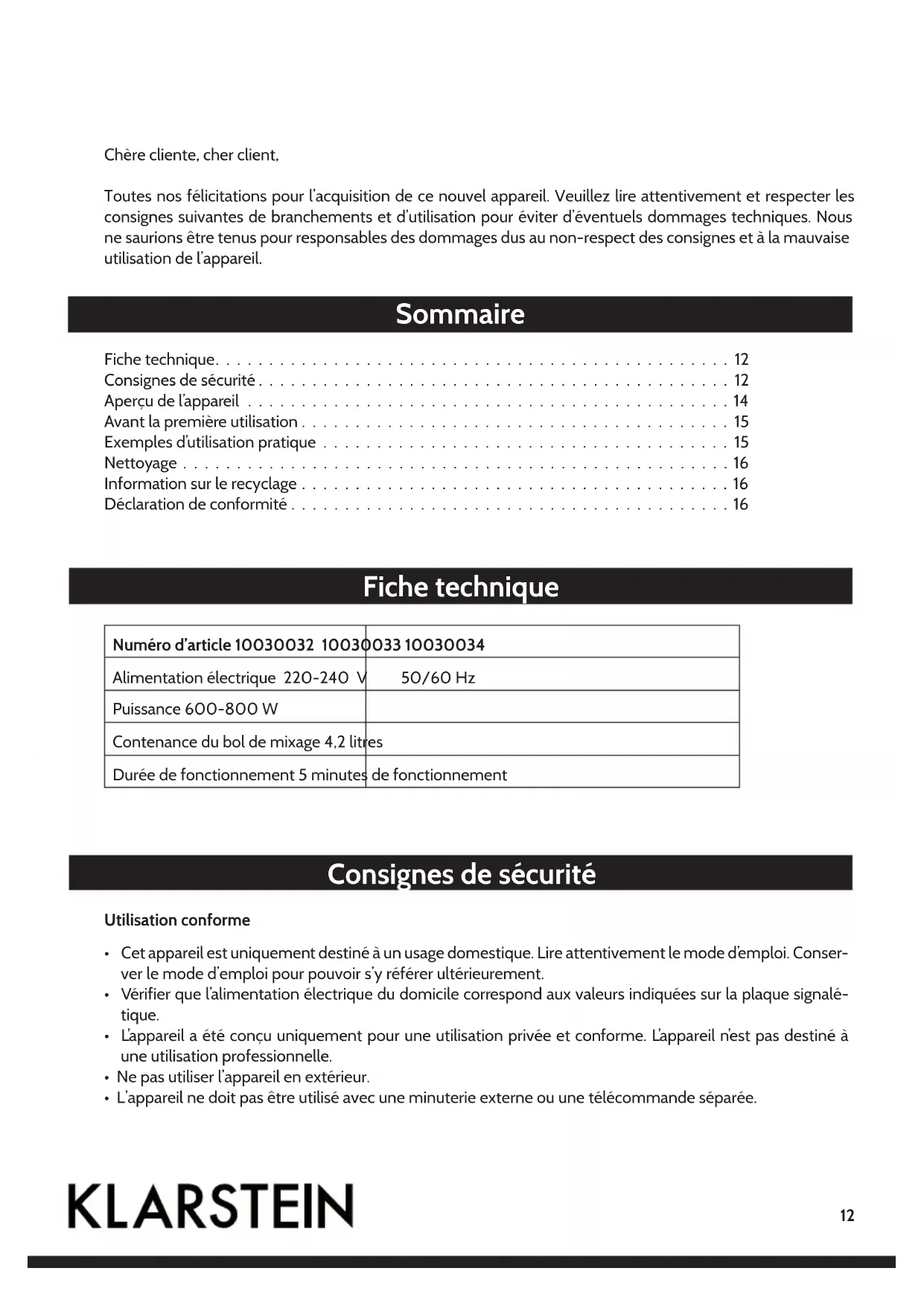 - Maximum operating time 5 minutes.12 Sommaire Fiche technique Consignes de sécurité Chère cliente, cher client, Toutes nos félicitations pour l’acquisition de ce nouvel appareil. Veuillez lire attentivement et respecter les consignes suivantes de branchements et d’utilisation pour éviter d’éventuels dommages techniques. Nous ne saurions être tenus pour responsables des dommages dus au non-respect des consignes et à la mauvaise utilisation de l’appareil. Numéro d’article 10030032 10030033 10030034 Alimentation électrique 220-240 V 50/60 Hz Puissance 600-800 W Contenance du bol de mixage 4,2 litres Durée de fonctionnement 5 minutes de fonctionnement Fiche technique . . . . . . . . . . . . . . . . . . . . . . . . . . . . . . . . . . . . . . . . . . . . . . . . 12 Consignes de sécurité . . . . . . . . . . . . . . . . . . . . . . . . . . . . . . . . . . . . . . . . . . . . 12 Aperçu de l’appareil . . . . . . . . . . . . . . . . . . . . . . . . . . . . . . . . . . . . . . . . . . . . . 14 Avant la première utilisation . . . . . . . . . . . . . . . . . . . . . . . . . . . . . . . . . . . . . . . . 15 Exemples d’utilisation pratique . . . . . . . . . . . . . . . . . . . . . . . . . . . . . . . . . . . . . . 15 Nettoyage . . . . . . . . . . . . . . . . . . . . . . . . . . . . . . . . . . . . . . . . . . . . . . . . . . . 16 Information sur le recyclage . . . . . . . . . . . . . . . . . . . . . . . . . . . . . . . . . . . . . . . . 16 Déclaration de conformité . . . . . . . . . . . . . . . . . . . . . . . . . . . . . . . . . . . . . . . . . 16 Utilisation conforme