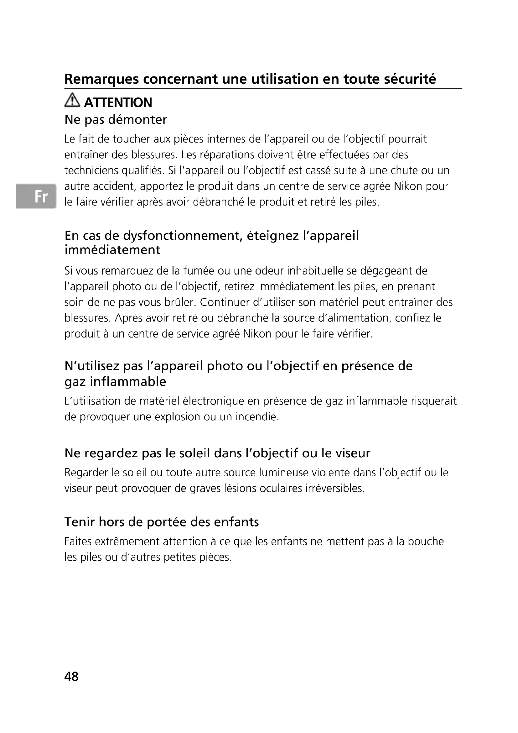 Remarques concernant une utilisation en toute sécurité ATTENTION Ne pas démonter Le fait de toucher aux pièces internes de l’appareil ou de l’objectif pourrait entraîner des blessures. Les réparations doivent être effectuées par des techniciens qualifiés. Si l’appareil ou l’objectif est cassé suite à une chute ou un autre accident, apportez le produit dans un centre de service agréé Nikon pour le faire vérifier après avoir débranché le produit et retiré les piles. En cas de dysfonctionnement, éteignez l’appareil immédiatement Si vous remarquez de la fumée ou une odeur inhabituelle se dégageant de l’appareil photo ou de l’objectif, retirez immédiatement les piles, en prenant soin de ne pas vous brûler. Continuer d’utiliser son matériel peut entraîner des blessures. Après avoir retiré ou débranché la source d’alimentation, confiez le produit à un centre de service agréé Nikon pour le faire vérifier. N’utilisez pas l’appareil photo ou l’objectif en présence de gaz inflammable L’utilisation de matériel électronique en présence de gaz inflammable risquerait de provoquer une explosion ou un incendie. Ne regardez pas le soleil dans l’objectif ou le viseur Regarder le soleil ou toute autre source lumineuse violente dans l’objectif ou le viseur peut provoquer de graves lésions oculaires irréversibles. Tenir hors de portée des enfants Faites extrêmement attention à ce que les enfants ne mettent pas à la bouche les piles ou d’autres petites pièces.49