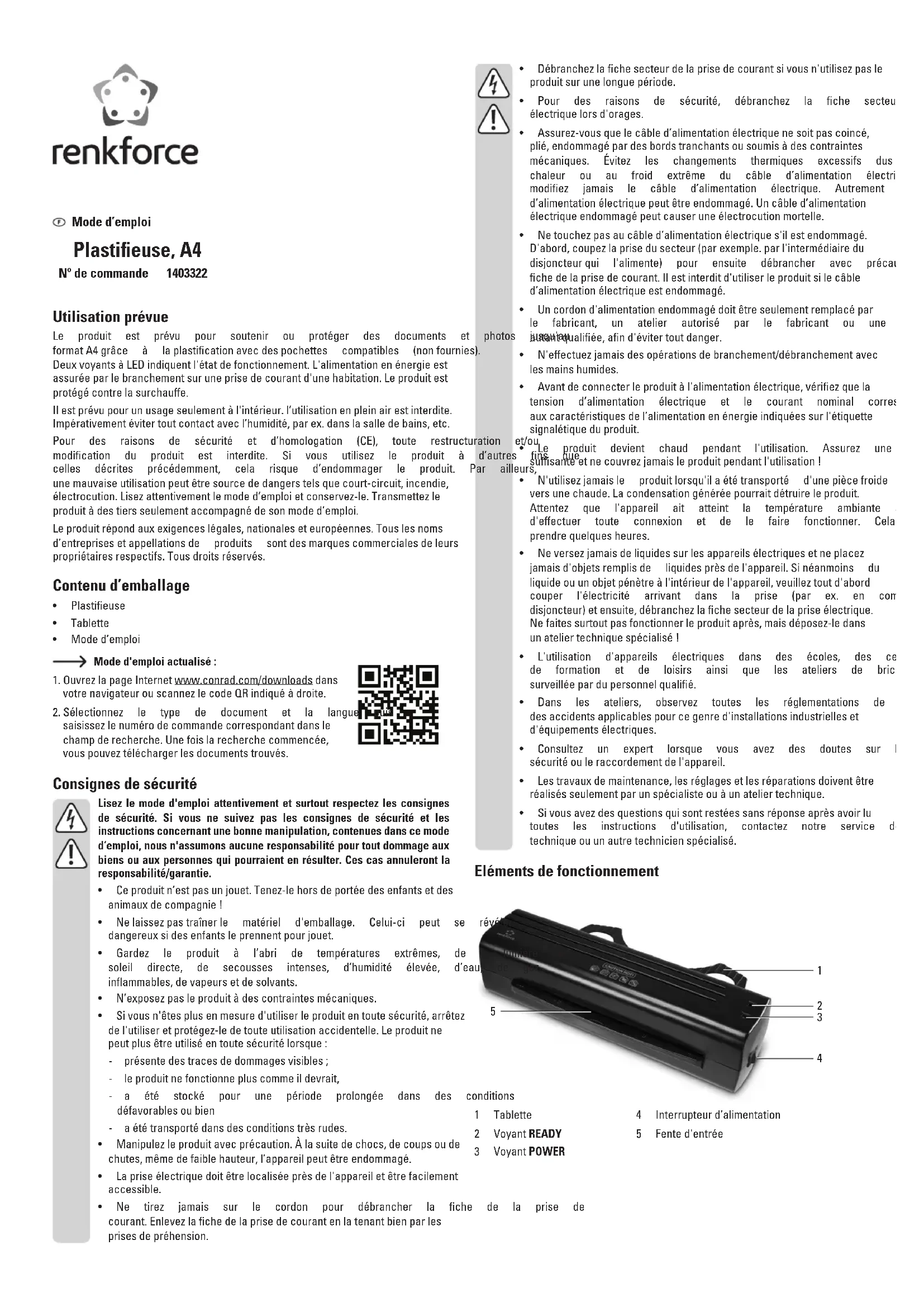 1403322 - Lamineuse Renkforce - Notice d'utilisation et mode d'emploi gratuit