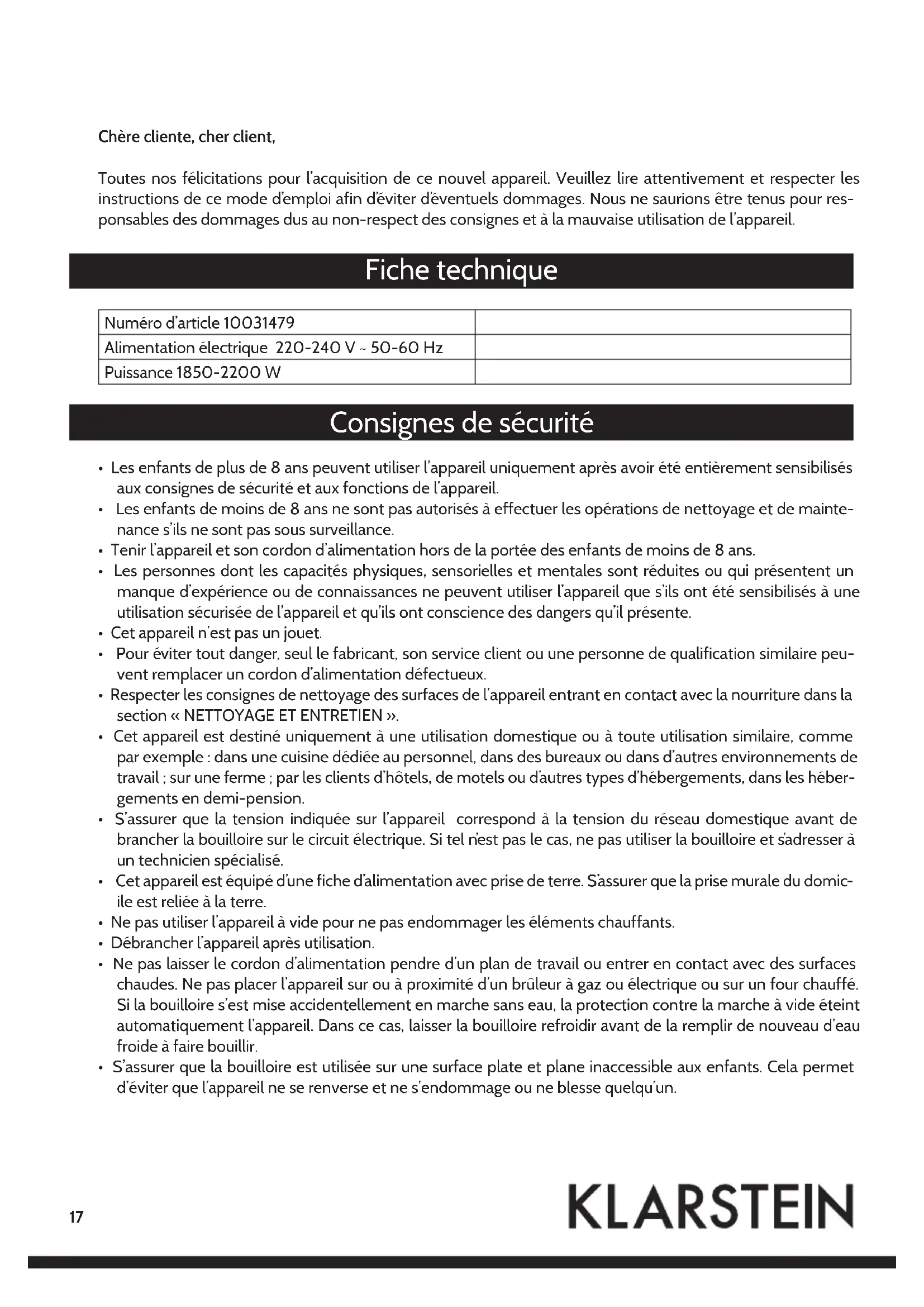 10031479 - Bouilloire Klarstein - Notice d'utilisation et mode d'emploi gratuit