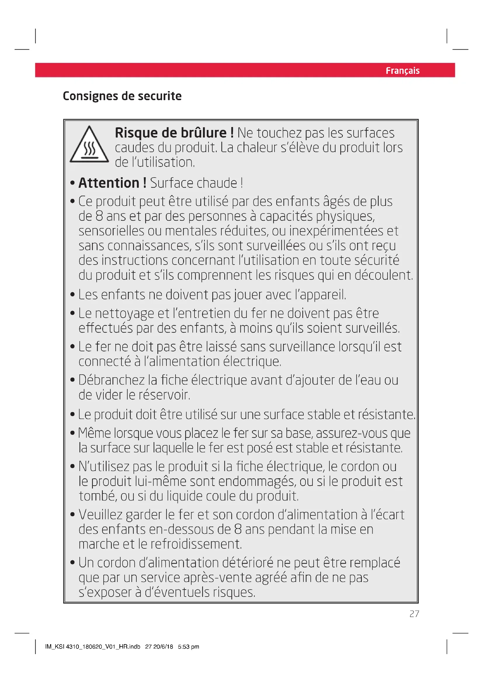 - Un cordon d’alimentation détérioré ne peut être remplacé que par un service après-vente agréé afin de ne pas s’exposer à d’éventuels risques. IM_KSI 4310_180620_V01_HR.indb 27 20/6/18 5:53 pmFrançais