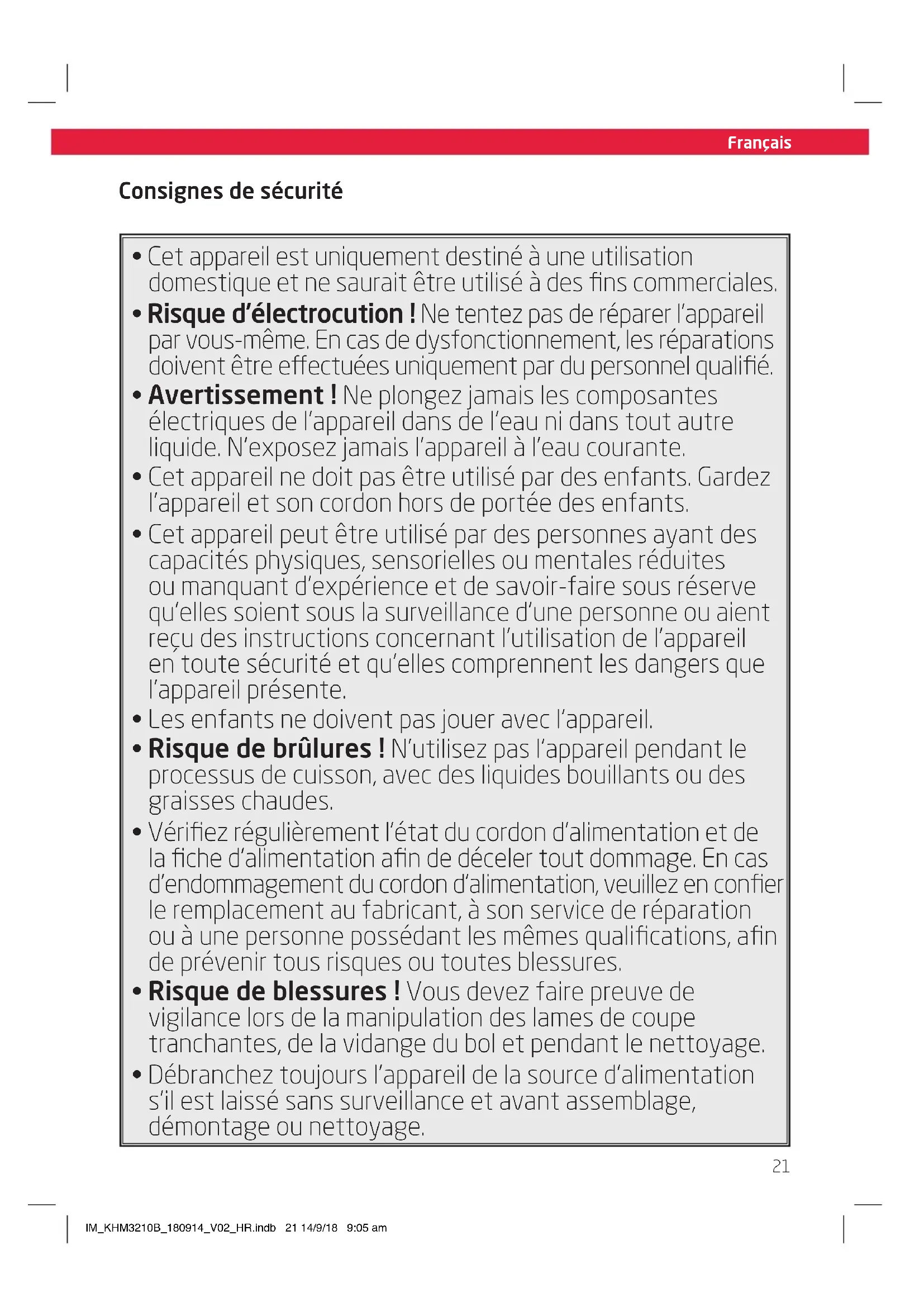 - Débranchez toujours l’appareil de la source d’alimentation s’il est laissé sans surveillance et avant assemblage, démontage ou nettoyage. IM_KHM3210B_180914_V02_HR.indb 21 14/9/18 9:05 am22 Français Size - A5 Consignes de sécurité