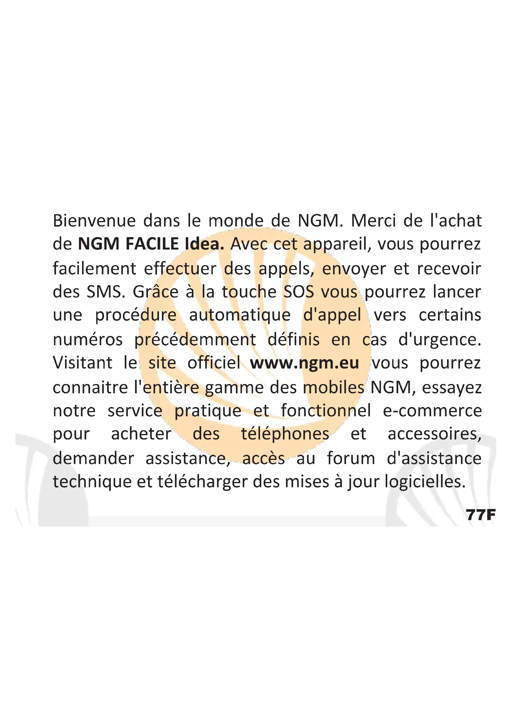 Copyright © 2015 NGM Italia Ninguna parte de esta publicación puede ser extraída, reproducida, traducida o utilizada de cualquier forma o en cualquier medio, electrónico o mecánico, incluido fotocopias y microfilm, sin previa autorización escrita por la NGM Italia.76 FRANÇAIS Guide rapide - Français77FRANÇAIS Bienvenue dans le monde de NGM. Merci de l'achat de NGM FACILE Idea. Avec cet appareil, vous pourrez facilement effectuer des appels, envoyer et recevoir des SMS. Grâce à la touche SOS vous pourrez lancer une procédure au tomatique d'appel vers certains numéros précédemment définis en cas d'urgence. Visitant le site officiel www.ngm.eu vous pourrez connaitre l'entière gamme des mobiles NGM, essayez notre service pratique et fonctionnel e-commerce pour acheter des téléphones et accessoires, demander assistance, accès au forum d'assistance technique et télécharger des mises à jour logicielles.78 FRANÇAIS Insérer la carte SIM la carte SIM contient votre numéro de téléphone, le code PIN, des liens vers des services de l'opérateur, les contacts et les messages SMS. Pour accéder au compartiment contenant la fente de la SIM, éteignez le téléphone et faites glisser la coque vers le bas. Enlevez la batterie, insérez la SIM dans sa fente avec les contacts dorés retournés vers le bas.