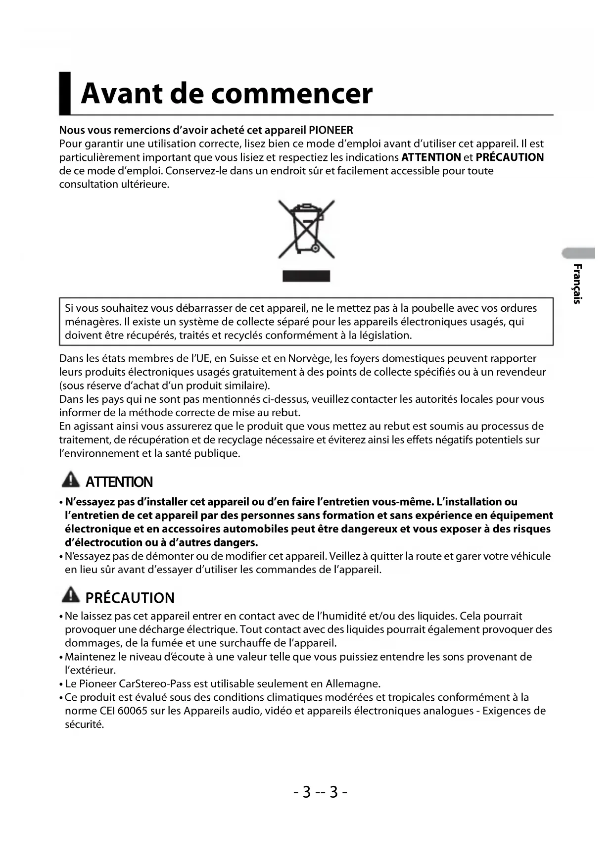 - Ce produit est évalué sous des conditions climatiques modérées et tropicales conformément à la norme CEI 60065 sur les Appareils audio, vidéo et appareils électroniques analogues - Exigences de sécurité. Avant de commencer Si vous souhaitez vous débarrasser de cet appareil, ne le mettez pas à la poubelle avec vos ordures ménagères. Il existe un système de collecte séparé pour les appareils électroniques usagés, qui doivent être récupérés, traités et recyclés conformément à la législation.- 4 - Français Si vous rencontrez des problèmes En cas d’anomalie, veuillez contacter votre revendeur ou le centre d’entretien agréé par PIONEER le plus proche.