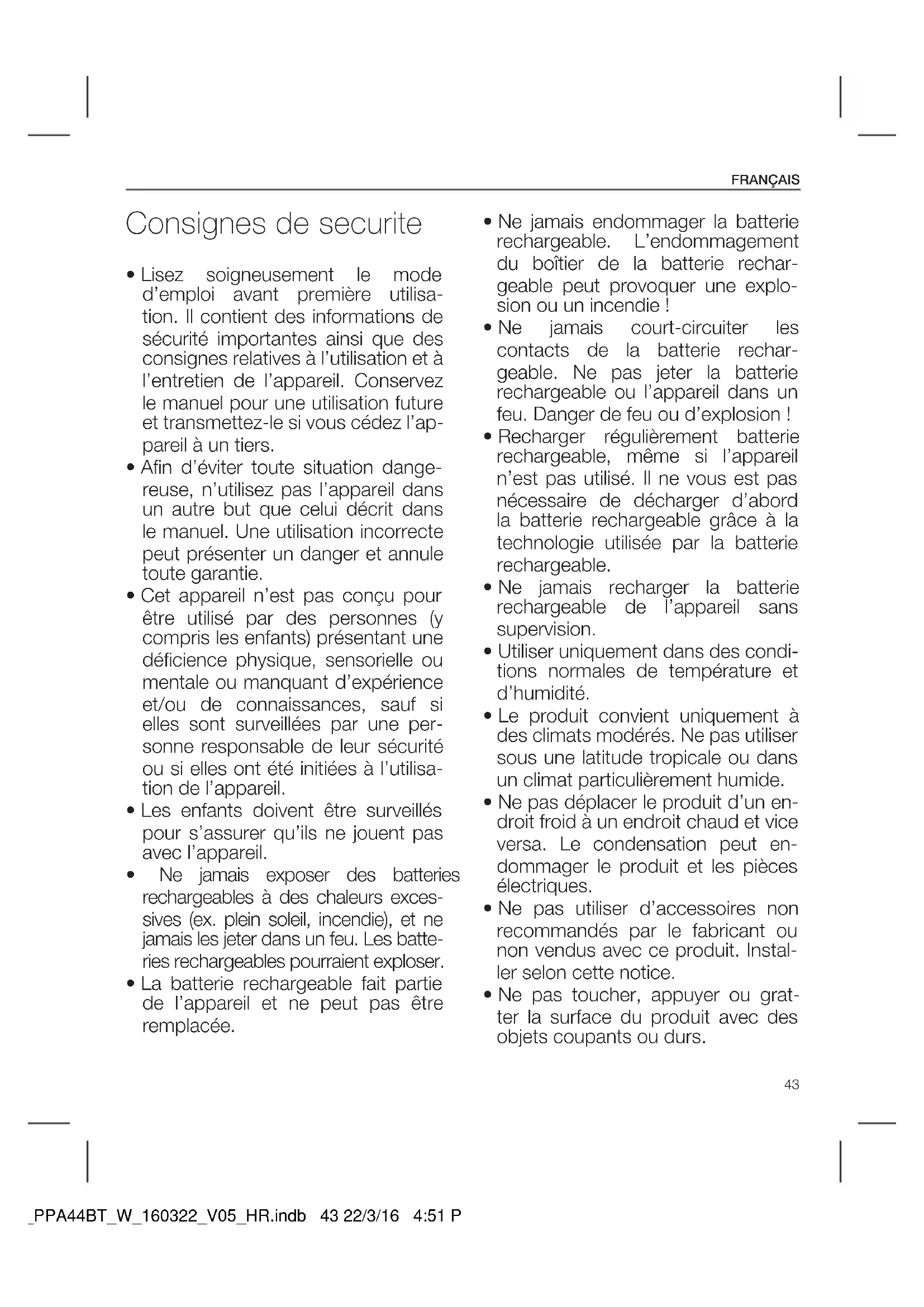 - Ne pas toucher, appuyer ou grat- ter la surface du produit avec des objets coupants ou durs. IM_PPA44BT_W_160322_V05_HR.indb 43 22/3/16 4:51 PMFRANÇAIS