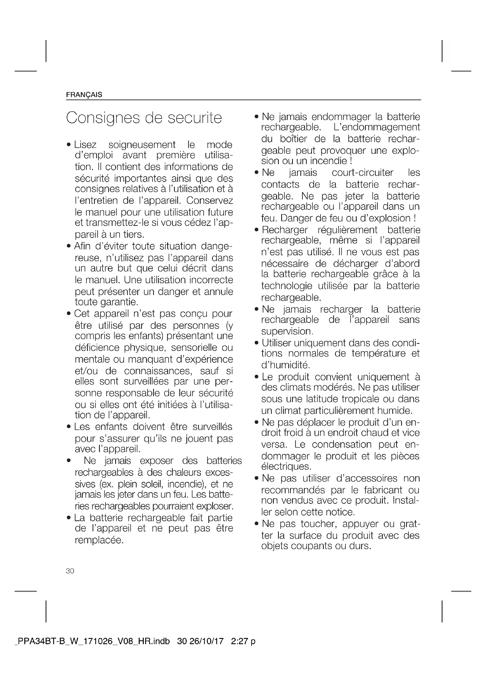 - Ne pas toucher, appuyer ou grat- ter la surface du produit avec des objets coupants ou durs. IM_PPA34BT-B_W_171026_V08_HR.indb 30 26/10/17 2:27 pm31 FRANÇAIS