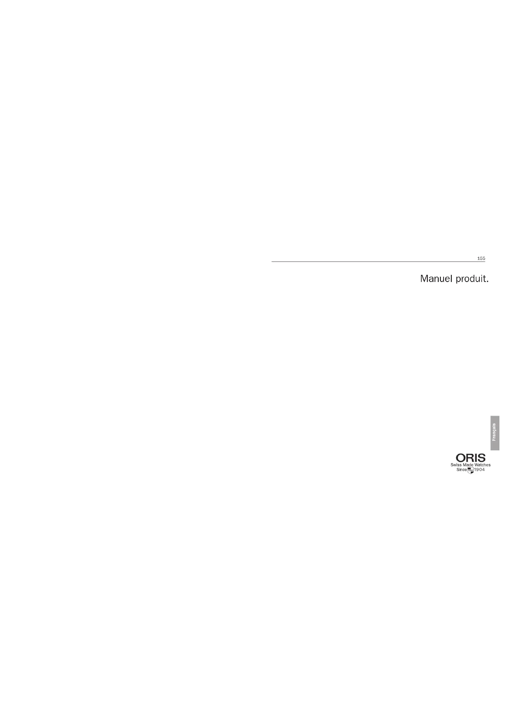 FrançaisNous vous félicitons de l’acquisi- tion de votre nouvelle montre Oris et vous souhaitons la bienvenue parmi les amateurs de montres mécaniques. Car la mécanique, et rien que la mécanique, c’est cela le monde d’Oris. Votre montre Oris, qui se distingue des produits de masse et à la mode, incarne de par son intérieur micromécanique fascinant et son extérieur élégant sans fioritures, les vraies valeurs de l’art horloger suisse. Les montres Oris ne sont pas seulement héritières d’une longue tradition remontant à 1904, elles renferment également toutes un dispositif High-Mech d’une grande finesse, marqué par le savoir artisanal de nos horlogers et développé en collabo- ration avec des professionnels cé- lèbres du monde de la Formule 1, de la plongée et de l’aviation. Et ce qui est très important à l’heure actuelle: c’est vous qui, par vos mouvements ou en la remontant manuellement, fournissez l’énergie écologique nécessaire à votre montre Oris qui fonctionne sans pile. Veuillez consulter notre site sous www.oris.ch pour obtenir davantage d’informations ainsi qu’un prolongement gratuit de votre garantie après vous être inscrit au Club MyOris