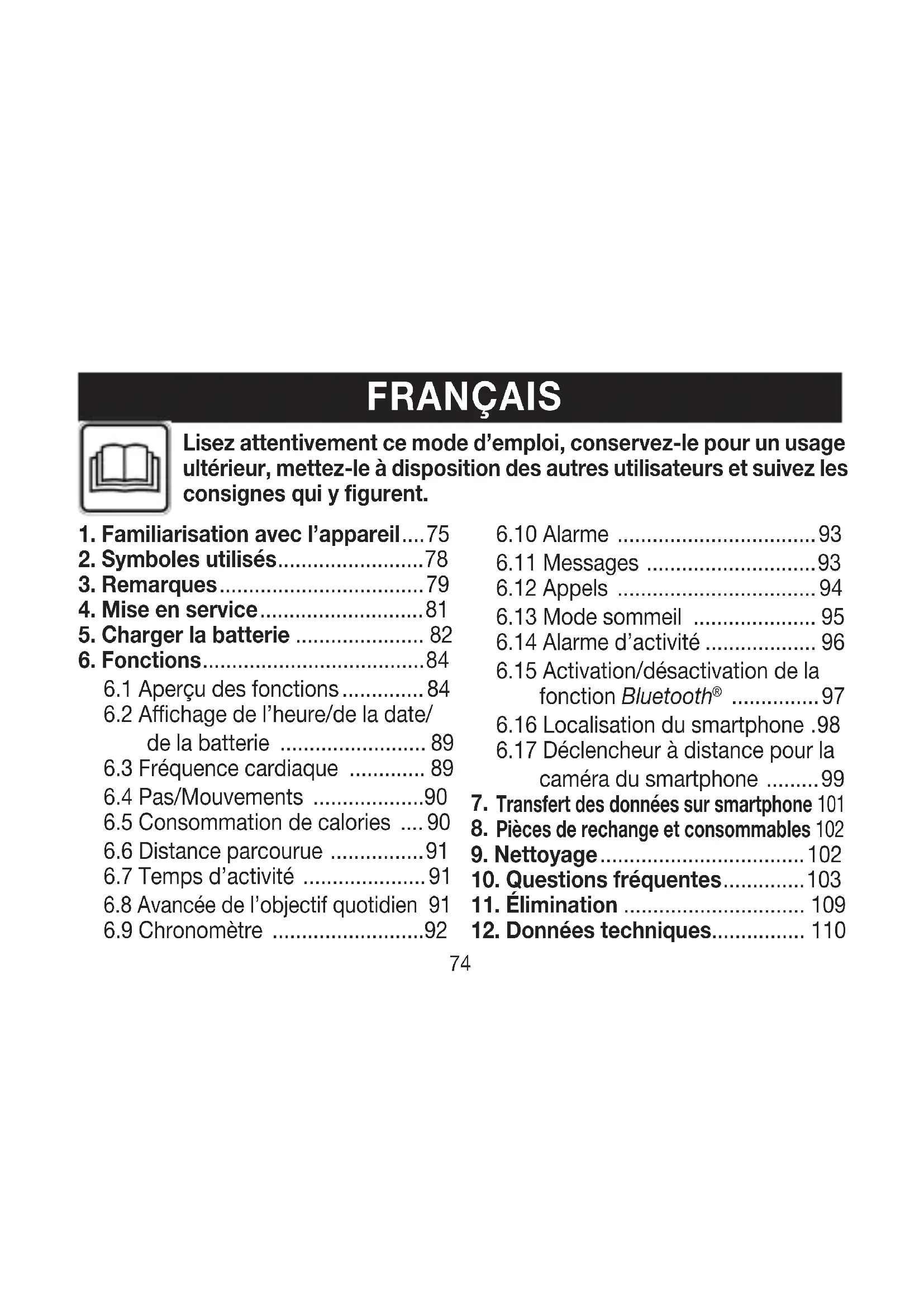Le capteur d’activité propose les fonctions suivantes: heure, date et état de la bat- terie, mesure de la fréquence cardiaque, podomètre, consommation de calories, distance parcourue, temps d’activité, objectif quotidien, chronomètre, alarme, mé- moire des mouvements, mode sommeil, notifications des messages/appels, loca- lisation du smartphone et déclencheur à distance pour la caméra du smartphone. Toutes les valeurs sont remises à zéro chaque jour à minuit. Les calculs et mesures reprennent alors à nouveau depuis le début. Pour naviguer entre les fonctions, appuyez sur la touche du capteur d’activité.84 85 Achage de l’heure/de la date/de la batterie Mode sommeil Fréquence cardiaque Alarme Pas Chronomètre Consommation de calories Avancée de l’objectif quotidien Distance Temps d’activité brève (1 s) Fréquence cardiaque (page 86) Menu chronométre (page 88) Menu multimédia (page 87) Menu multimédia (page 87) Mode sommeil (page 86) Menu multimédia (page 87) brève (1 s) brève (1 s) brève (1 s) brève (1 s) brève (1 s) brève (1 s) Pression longue (3 s) Pression longue (3 s) Pression longue (3 s) Pression longue (3 s) brève (1 s) brève (1 s) brève (1 s)86 Recherche de la fréquence cardiaqueFréquence cardiaque Fréquence cardiaque désactivée Fréquence cardiaque Mode sommeil Mode sommeil Mode sommeil activé longue (3 s) longue (3 s) automatique automatique longue (3 s) automatique Mode sommeil désactivée86 87 Bluetooth
