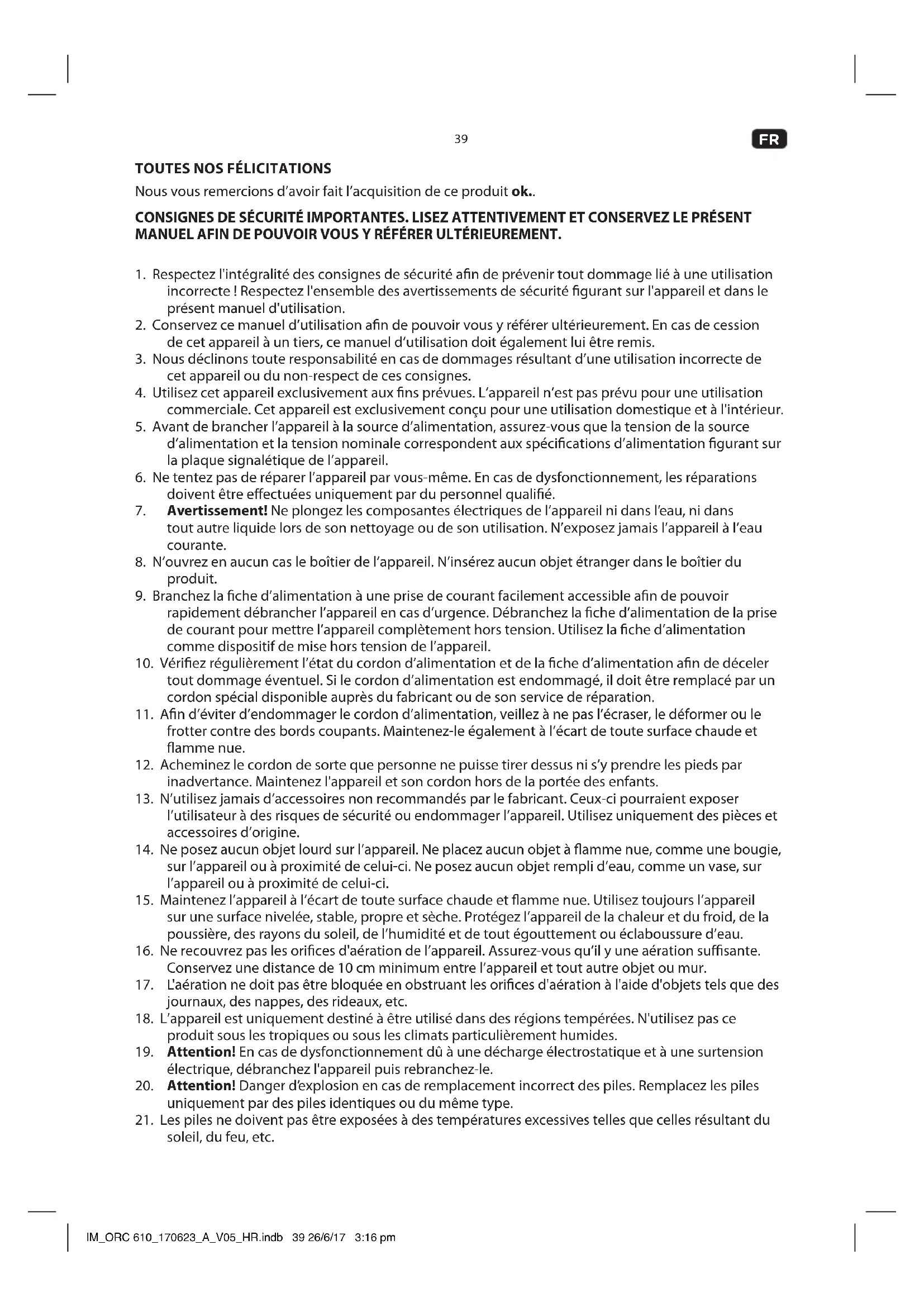 18. L’appareil est uniquement destiné à être utilisé dans des régions tempérées. N'utilisez pas ce