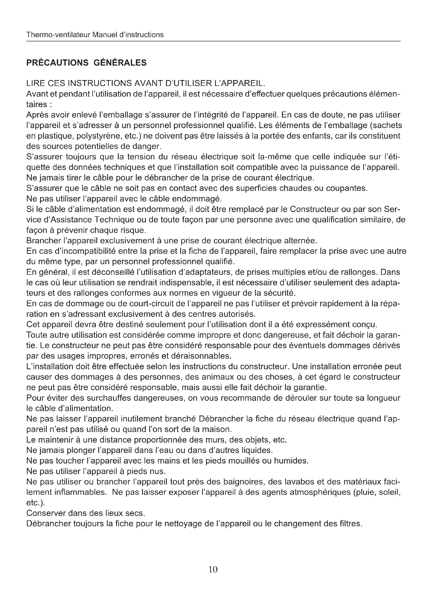 Ne pas laisser le thermo-ventilateur en fonction sans surveillance. Avant de laisser la pièce, vérifier qu'il est et débrancher la fiche de la prise.