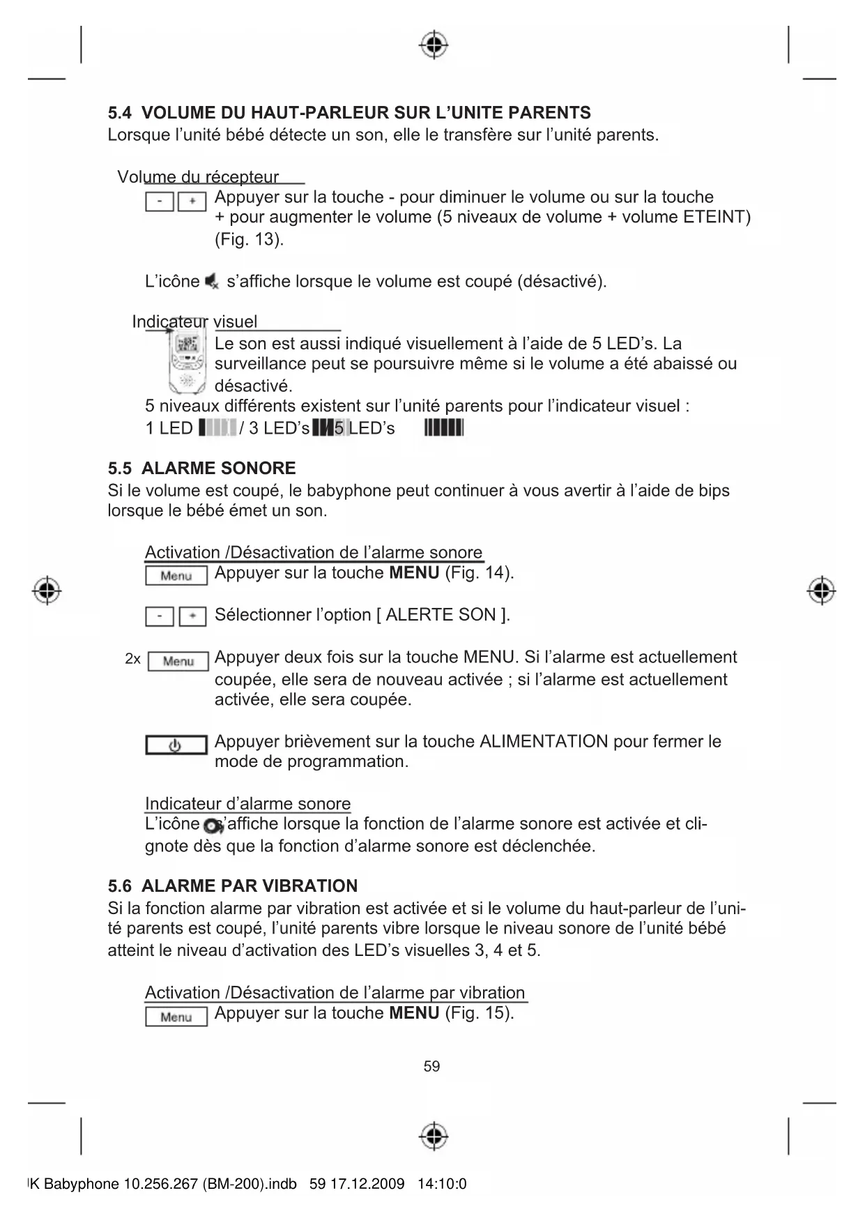 Lorsque l’unité bébé détecte un son, elle le transfère sur l’unité parents. Volume du récepteur Appuyer sur la touche - pour diminuer le volume ou sur la touche + pour augmenter le volume (5 niveaux de volume + volume ETEINT) (Fig. 13). L’icône s’affiche lorsque le volume est coupé (désactivé). Indicateur visuel Le son est aussi indiqué visuellement à l’aide de 5 LED’s. La surveillance peut se poursuivre même si le volume a été abaissé ou désactivé. 5 niveaux différents existent sur l’unité parents pour l’indicateur visuel : 1 LED / 3 LED’s / 5 LED’s