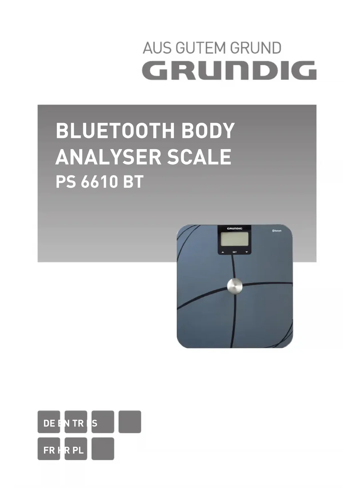 APERÇU __________________________________ Chère cliente, cher client, Nous vous félicitons d’avoir choisi la balance d’analyse corporelle avec Bluetooth PS 6610 BT. Veuillez lire attentivement le guide d’utilisation de la balance pour pouvoir profiter de la qualité de votre appareil Grundig pendant de nombreuses années à venir à domicile. Commerce responsable ! Que ce soit en interne ou dans les rapports avec ses fournisseurs, GRUNDIG met l’accent sur des conditions de travail sociales contractuellement garanties avec des salaires justes, sur l’utilisation efficace de matériaux bruts avec une constante réduction des déchets de plusieurs tonnes de plastique chaque année – et sur une disponibilité d’au moins 5 ans de tous les accessoires. Pour un avenir digne d’être vécu. Pour une bonne raison. Grundig. Attention