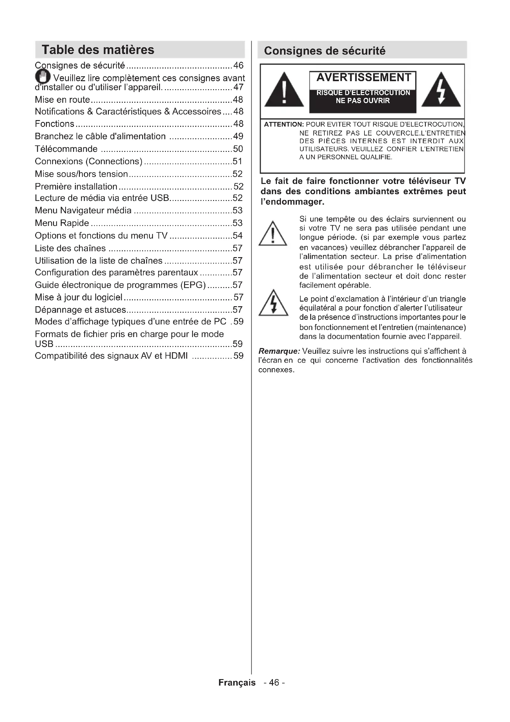 - Compatibilité des signaux AV et HDMI Consignes de sécurité Le fait de faire fonctionner votre téléviseur TV dans des conditions ambiantes extrêmes peut l’endommager. AVERTISSEMENT RISQUE D’ELECTROCUTIONNE PAS OUVRIRATTENTION: POUR EVITER TOUT RISQUE D’ELECTROCUTION, NE RETIREZ PAS LE COUVERCLE.L’ENTRETIEN DES PIÈCES INTERNES EST INTERDIT AUX UTILISATEURS. VEUILLEZ CONFIER L’ENTRETIEN A UN PERSONNEL QUALIFIE.Remarque: Veuillez suivre les instructions qui s’afchent à l’écran en ce qui concerne l’activation des fonctionnalités connexes.Si une tempête ou des éclairs surviennent ou si votre TV ne sera pas utilisée pendant une longue période. (si par exemple vous partez en vacances) veuillez débrancher l’appareil de l’alimentation secteur. La prise d’alimentation est utilisée pour débrancher le téléviseur de l’alimentation secteur et doit donc rester facilement opérable.Le point d’exclamation à l’intérieur d’un triangle équilatéral a pour fonction d’alerter l’utilisateur de la présence d’instructions importantes pour le bon fonctionnement et l’entretien (maintenance) dans la documentation fournie avec l’appareil.Français - 47 - ATTENTION: Pour éviter toute blessure, le téléviseur doit être solidement xé au mûr conformément aux instructions d'installation (si l'option est disponible). p. 59