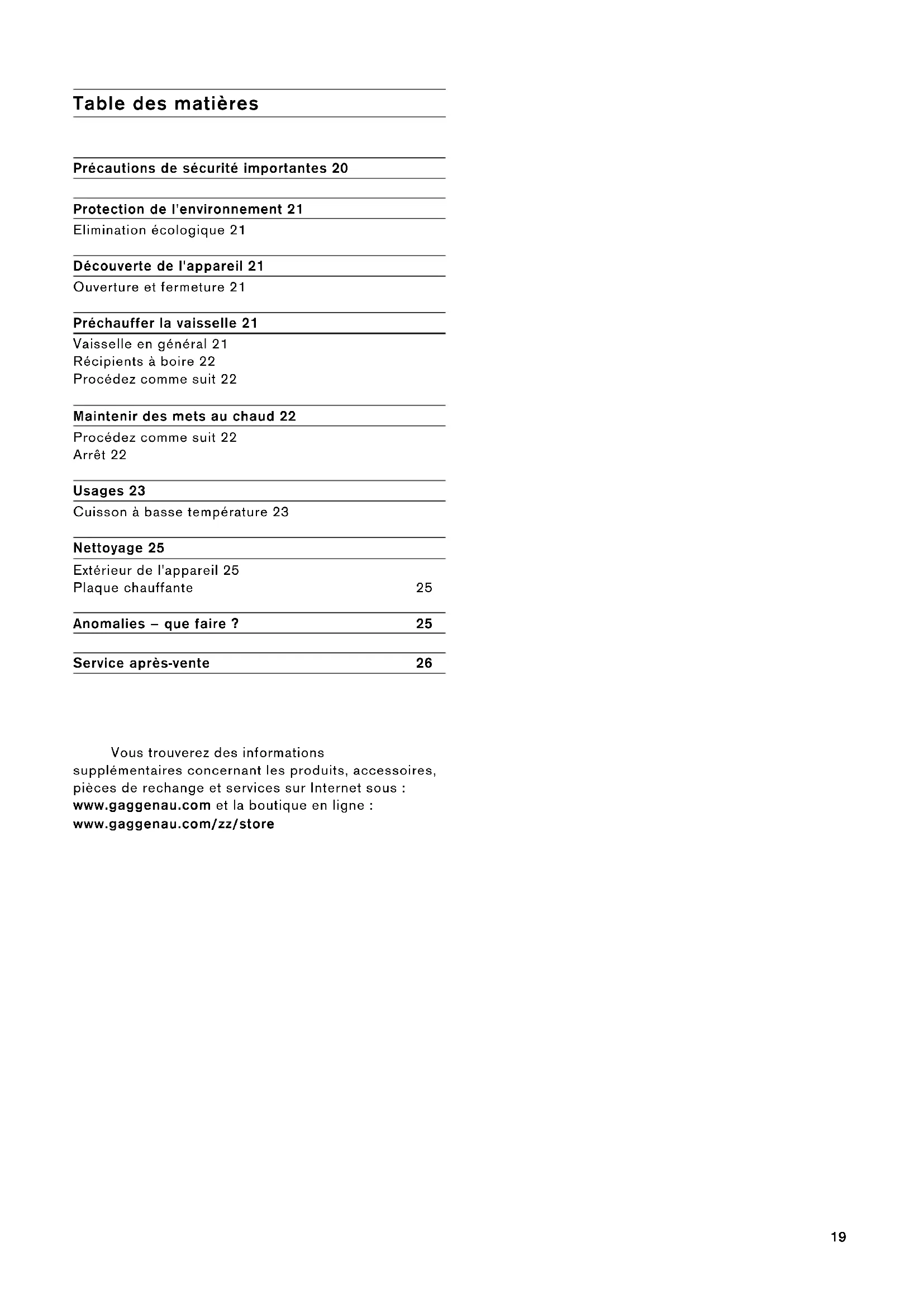 Off peak 0.0088 € per minute. AU 1300 368 339 NZ 09 477 049219 Table des matières Notice d'uti li sati on Précautions de sécurité importantes 20 Protection de l'environnement 21 Elimination écologique 21 Découverte de l'appareil 21 Ouverture et fermeture 21 Préchauffer la vaisselle 21 Vaisselle en général 21 Récipients à boire 22 Procédez comme suit 22 Maintenir des mets au chaud 22 Procédez comme suit 22 Arrêt 22 Usages 23 Cuisson à basse température 23 Nettoyage 25 Extérieur de l'appareil 25 Plaque chauffante 25 Anomalies – que faire ? 25 Service après-vente 26 : Vous trouverez des informations supplémentaires concernant les produits, accessoires, pièces de rechange et services sur Internet sous : www.gaggenau.com et la boutique en ligne : www.gaggenau.com/zz/store20 m Précautions de sécurité importantes Lire attentivement ce manuel. Ce n'est qu'alors que vous pourrez utiliser votre appareil correctement et en toute sécurité. Conserver la notice d'utilisation et de montage pour un usage ultérieur ou pour le propriétaire suivant. Contrôler l'état de l'appareil après l'avoir déballé. Ne pas le raccorder s'il présente des avaries de transport. Cet appareil est destiné exclusivement à une utilisation domestique et non professionnelle. Utiliser l'appareil exclusivement pour maintenir des mets au chaud ou pour chauffer de la vaisselle. Cet appareil est conçu pour une utilisation jusqu'à une altitude maximale de 4 000 m. Cet appareil peut être utilisé par des enfants de 8 ans ou plus et par des personnes dotées de capacités physiques, sensorielles ou mentales réduites ou disposant de connaissances ou d’expérience insuffisantes, sous la surveillance d'un tiers responsable de leur sécurité ou bien lorsqu'ils ont reçu des instructions liées à l'utilisation de l'appareil en toute sécurité et qu'ils ont intégré les risques qui en résultent. Les enfants ne doivent pas jouer avec l'appareil. Le nettoyage et l'entretien effectué par l'utilisateur ne doivent pas être accomplis par des enfants, sauf s'ils sont âgés de 15 ans et plus et qu'un adulte les surveille. Les enfants de moins de 8 ans doivent être tenus à distance de l'appareil et du cordon d'alimentation. Risque de brûlure ! ▯ La plaque chauffante dans le tiroir chauffant devient très chaude. Ne jamais toucher la plaque chauffante. Eloigner les enfants. Risque de brûlure ! ▯ Les récipients ou les accessoires deviennent très chaud. Toujours utiliser des maniques pour retirer le récipient ou les accessoires du compartiment de cuisson. Risque de choc électrique ! ▯ L'isolation des câbles des appareils électroménagers peut fondre au contact des pièces chaudes de l'appareil. Ne jamais mettre le câble de raccordement des appareils électroménagers en contact avec des pièces chaudes de l'appareil. Risque de choc électrique ! ▯ De l'humidité qui pénètre peut occasionner un choc électrique. Ne pas utiliser de nettoyeur haute pression ou de nettoyeur à vapeur. Risque de choc électrique ! ▯ Un appareil défectueux peut provoquer un choc électrique. Ne jamais mettre en service un appareil défectueux. Débrancher la fiche secteur ou enlever le fusible dans le boîtier à fusibles. Appeler le service après-vente. Risque de choc électrique ! ▯ Les fêlures et cassures dans la plaque en verre peuvent occasionner des chocs électriques. Couper le fusible dans la boîte à fusibles. Appeler le service aprèsvente. Risque de choc électrique ! ▯ Les réparations inexpertes sont dangereuses. Seul un technicien du service après-vente formé par nos soins est habilité à effectuer des réparations. Si l'appareil est défectueux, retirer la fiche secteur ou enlever le fusible dans le boîtier à fusibles. Appeler le service aprèsvente. Risque d'incendie ! La plaque chauffante dans le tiroir chauffant devient très chaude, des matières inflammables peuvent s'enflammer. Ne jamais conserver des objets inflammables ou des récipients en plastique dans le tiroir chauffant.21 Protection de l'environnement Elimination écologique Découverte de l'appareil Dans le tiroir de chauffage vous pouvez préchauffer de la vaisselle ou maintenir des aliments au chaud. L'appareil chauffe uniquement si le tiroir est correctement fermé. Ouverture et fermeture En bas de l'appareil il y a un creux qui sert de poignée pour ouvrir et fermer. Lors de l'ouverture et de la fermeture de l'appareil, l'éclairage du compartiment de cuisson est automatiquement activé ou désactivé. Vous pouvez aussi désactiver l'éclairage du compartiment de cuisson de façon permanente. Pour cela, introduisez la main dans le compartiment de cuisson et éteignez l'éclairage en haut à gauche. Préchauffer la vaisselle Les mets refroidissent moins vite dans une vaisselle préchauffée. Les boissons restent plus longtemps chaudes. Vaisselle en général Vous pouvez charger le tiroir de chauffage d'un poids maximal de 25 kg. Vous pouvez p.ex. préchauffer de la vaisselle de table pour 6 à 12 personnes. Eliminez l'emballage en respectant l'environnement. Cet appareil est marqué selon la directive européenne 2012/19/UE relative aux appareils électriques et électroniques usagés (waste electrical and electronic equipment - WEEE). La directive définit le cadre pour une reprise et une récupération des appareils usagés applicables dans les pays de la CE. (FODLUDJHGXFRPSDUWLPHQWGHFXLVVRQ 3ODTXHGHFKDXIIDJH 9HQWLODWHXUHWFKDXIIDJH GpPDUUHQWORUVGHODSRVLWLRQ 3UpFKDXIIDJHGHYDLVVHOOH 7pPRLQGHVHUYLFH /RUVTXHYRXVDOOXPH]ODSSDUHLO