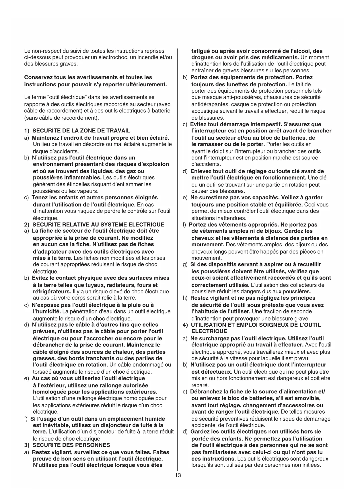 ELECTRIQUE a) Ne surchargez pas l’outil électrique. Utilisez l’outil électrique approprié au travail à eectuer. Avec l’outil électrique approprié, vous travaillerez mieux et avec plus de sécurité à la vitesse pour laquelle il est prévu. b) N’utilisez pas un outil électrique dont l’interrupteur est défectueux. Un outil électrique qui ne peut plus être mis en ou hors fonctionnement est dangereux et doit être réparé. c) Débranchez la che de la source d’alimentation et/ ou enlevez le bloc de batteries, s’il est amovible, avant tout réglage, changement d’accessoires ou avant de ranger l’outil électrique. De telles mesures de sécurité préventives réduisent le risque de démarrage accidentel de l’outil électrique. d) Gardez les outils électriques non utilisés hors de portée des enfants. Ne permettez pas l’utilisation de l’outil électrique à des personnes qui ne se sont pas familiarisées avec celui-ci ou qui n’ont pas lu ces instructions. Les outils électriques sont dangereux lorsqu’ils sont utilisés par des personnes non initiées. Le non-respect du suivi de toutes les instructions reprises ci-dessous peut provoquer un électrochoc, un incendie et/ou des blessures graves. Conservez tous les avertissements et toutes les instructions pour pouvoir s’y reporter ultérieurement. Le terme “outil électrique” dans les avertissements se rapporte à des outils électriques raccordés au secteur (avec câble de raccordement) et à des outils électriques à batterie (sans câble de raccordement).