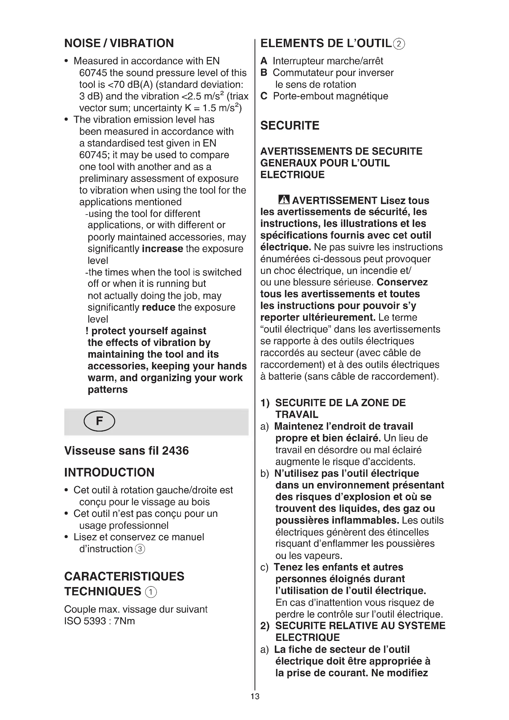 ELECTRIQUE a) La che de secteur de l’outil électrique doit être appropriée à la prise de courant. Ne modiez NOISE / VIBRATION