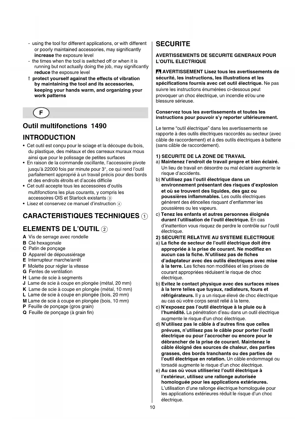 A Vis de serrage avec rondelle B Clé hexagonale C Patin de ponçage D Appareil de dépoussiérage E Interrupteur marche/arrêt F Molette pour régler la vitesse G Fentes de ventilation H Lame de scie à segments J Lame de scie à coupe en plongée (métal, 20 mm) K Lame de scie à coupe en plongée (métal, 10 mm) L Lame de scie à coupe en plongée (bois, 20 mm) M Lame de scie à coupe en plongée (bois, 10 mm) P Feuille de ponçage (gros grain) Q Feuille de ponçage (à grain n) SECURITE