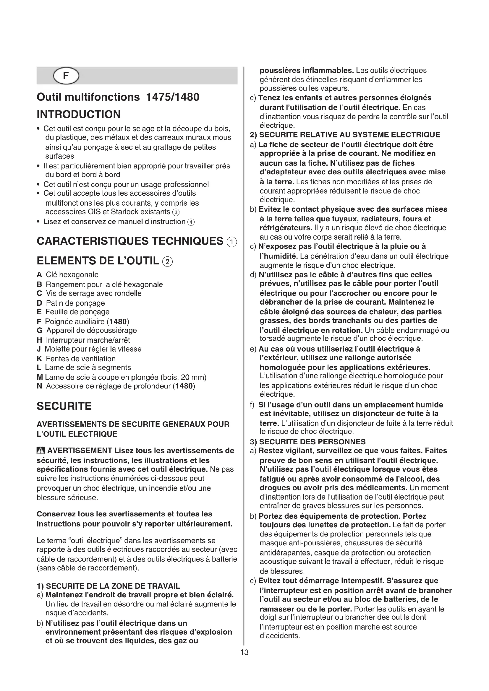 A Clé hexagonale B Rangement pour la clé hexagonale C Vis de serrage avec rondelle D Patin de ponçage E Feuille de ponçage F Poignée auxiliaire (1480) G Appareil de dépoussiérage H Interrupteur marche/arrêt J Molette pour régler la vitesse K Fentes de ventilation L Lame de scie à segments M Lame de scie à coupe en plongée (bois, 20 mm) N Accessoire de réglage de profondeur (1480) SECURITE