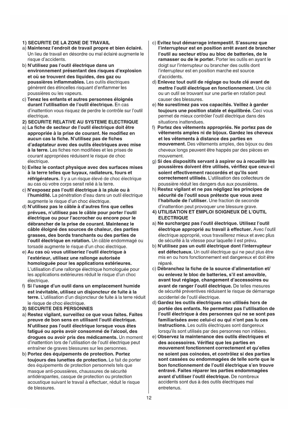 AVERTISSEMENT Lisez tous les avertissements de sécurité, les instructions, les illustrations et les spécifications fournis avec cet outil électrique. Ne pas suivre les instructions énumérées ci-dessous peut provoquer un choc électrique, un incendie et/ou une blessure sérieuse. Conservez tous les avertissements et toutes les instructions pour pouvoir s’y reporter ultérieurement. Le terme “outil électrique” dans les avertissements se rapporte à des outils électriques raccordés au secteur (avec câble de raccordement) et à des outils électriques à batterie (sans câble de raccordement).12
