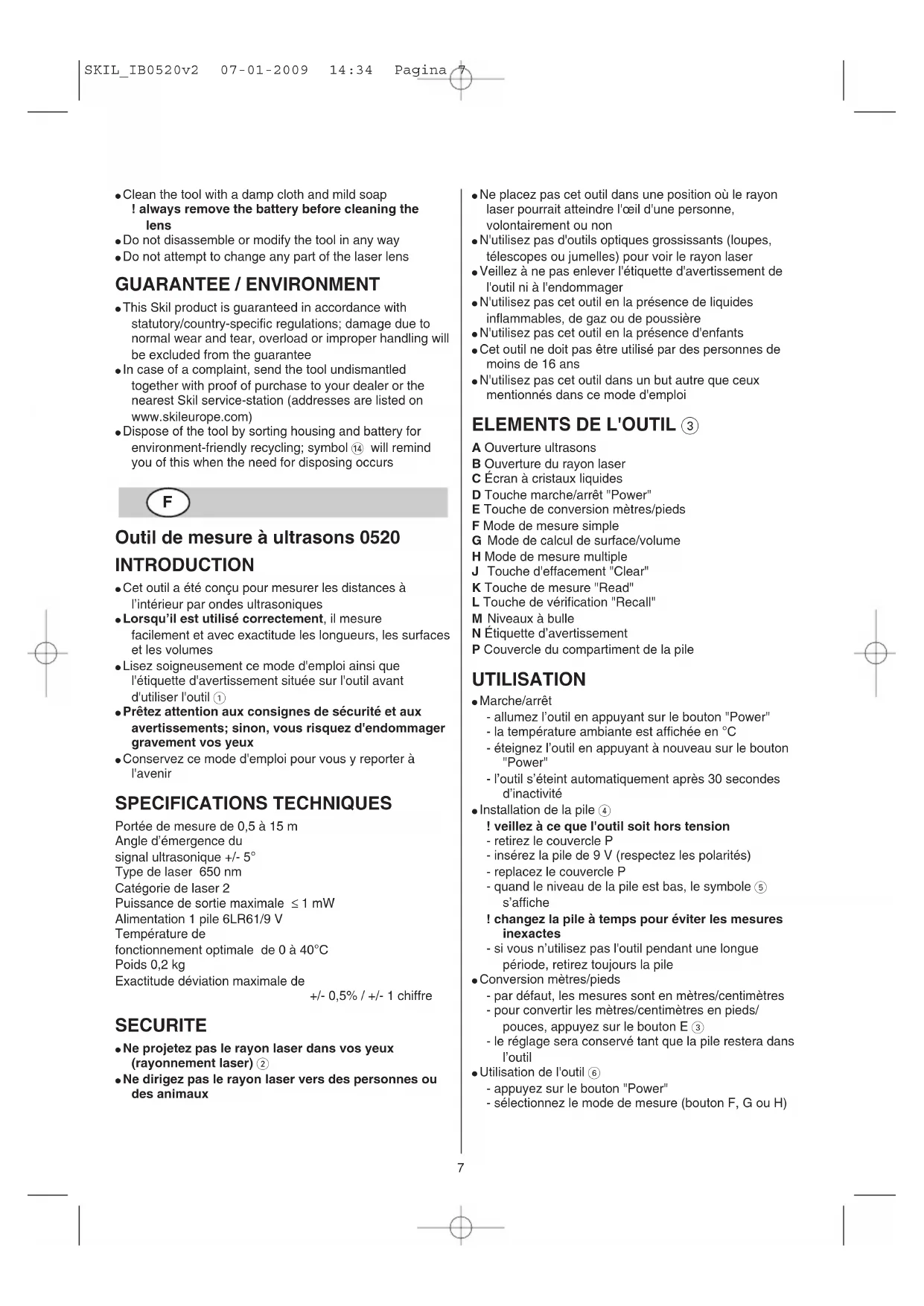 SKIL_IB0520v2 07-01-2009 14:34 Pagina 6● Clean the tool with a damp cloth and mild soap ! always remove the battery before cleaning the lens ● Do not disassemble or modify the tool in any way ● Do not attempt to change any part of the laser lens GUARANTEE / ENVIRONMENT ● This Skil product is guaranteed in accordance with statutory/country-specific regulations; damage due to normal wear and tear, overload or improper handling will be excluded from the guarantee ● In case of a complaint, send the tool undismantled together with proof of purchase to your dealer or the nearest Skil service-station (addresses are listed on www.skileurope.com) ● Dispose of the tool by sorting housing and battery for environment-friendly recycling; symbol $ will remind you of this when the need for disposing occurs Outil de mesure à ultrasons 0520 INTRODUCTION ● Cet outil a été conçu pour mesurer les distances à l’intérieur par ondes ultrasoniques ● Lorsqu’il est utilisé correctement, il mesure facilement et avec exactitude les longueurs, les surfaces et les volumes ● Lisez soigneusement ce mode d'emploi ainsi que l'étiquette d'avertissement située sur l'outil avant d'utiliser l'outil 1 ● Prêtez attention aux consignes de sécurité et aux avertissements; sinon, vous risquez d'endommager gravement vos yeux ● Conservez ce mode d'emploi pour vous y reporter à l'avenir SPECIFICATIONS TECHNIQUES Portée de mesure de 0,5 à 15 m Angle d’émergence du signal ultrasonique +/- 5° Type de laser 650 nm Catégorie de laser 2 Puissance de sortie maximale ≤ 1 mW Alimentation 1 pile 6LR61/9 V Température de fonctionnement optimale de 0 à 40°C Poids 0,2 kg Exactitude déviation maximale de +/- 0,5% / +/- 1 chiffre SECURITE ● Ne projetez pas le rayon laser dans vos yeux (rayonnement laser) 2 ● Ne dirigez pas le rayon laser vers des personnes ou des animaux ● Ne placez pas cet outil dans une position où le rayon laser pourrait atteindre l'œil d'une personne, volontairement ou non ● N'utilisez pas d'outils optiques grossissants (loupes, télescopes ou jumelles) pour voir le rayon laser ● Veillez à ne pas enlever l'étiquette d'avertissement de l'outil ni à l'endommager ● N'utilisez pas cet outil en la présence de liquides inflammables, de gaz ou de poussière ● N'utilisez pas cet outil en la présence d'enfants ● Cet outil ne doit pas être utilisé par des personnes de moins de 16 ans ● N'utilisez pas cet outil dans un but autre que ceux mentionnés dans ce mode d'emploi