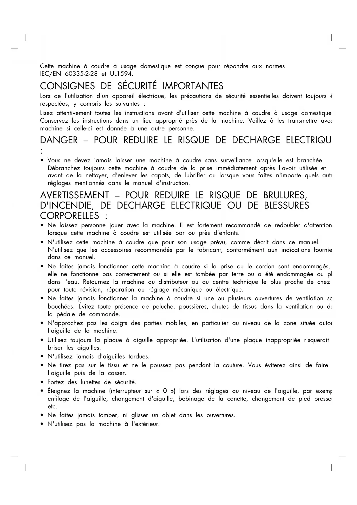 FRCette machine à coudre à usage domestique est conçue pour répondre aux normes IEC/EN 60335-2-28 et UL1594.